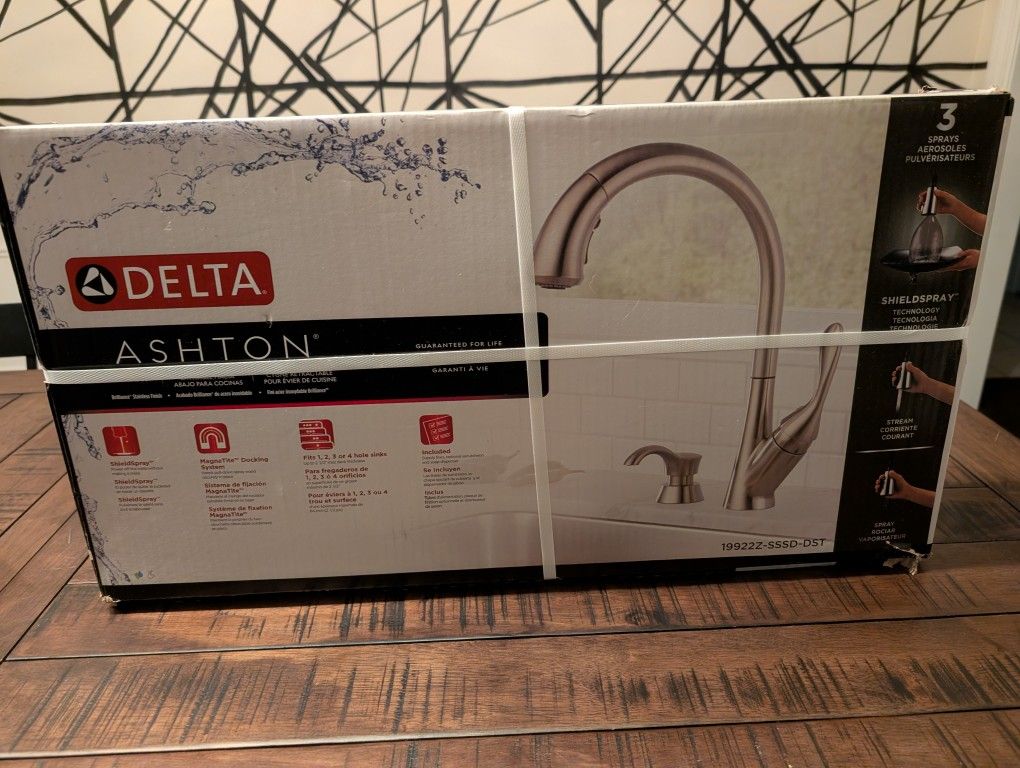 *BRAND NEW* Delta Ashton Stainless Steel Single Handle Deck-mount Pull-down Kitchen Faucet with Sprayer (Includes Deck Plate) (Includes Soap Dispenser) Model # 19922Z-SSSD-DST Sell for $189 + tax at Lowes $115 I live by Washington and Oak Bluff in Naperville. Thanks, Paul 630 x 202 __ 8925 Highlights MagnaTite Docking kitchen faucets use a powerful integrated magnet to snap your faucet spray wand precisely into place and hold it there so it stays docked when not in use and doesn’t droop over time Soft, rubber Touch-Clean spray holes allow you to easily wipe away calcium and lime buildup with the touch of a finger on your kitchen sink faucet Diamond Seal Technology is less hassle to install and helps your faucet perform like new for life, reducing leak points and lasting twice as long as the industry standard kitchen faucet Everything you need is together in one convenient box, including integrated InnoFlex PEX supply lines with pull-down kitchen faucet DIAMOND Seal Technology is less hassle to install and helps your faucet perform like new for life, reducing leak points and lasting twice as long as the industry standard Includes coordinating soap dispenser Fits 1, 2, 3, or 4-hole installations Optional escutcheon included for use with additional mounting configurations and a cohesive look