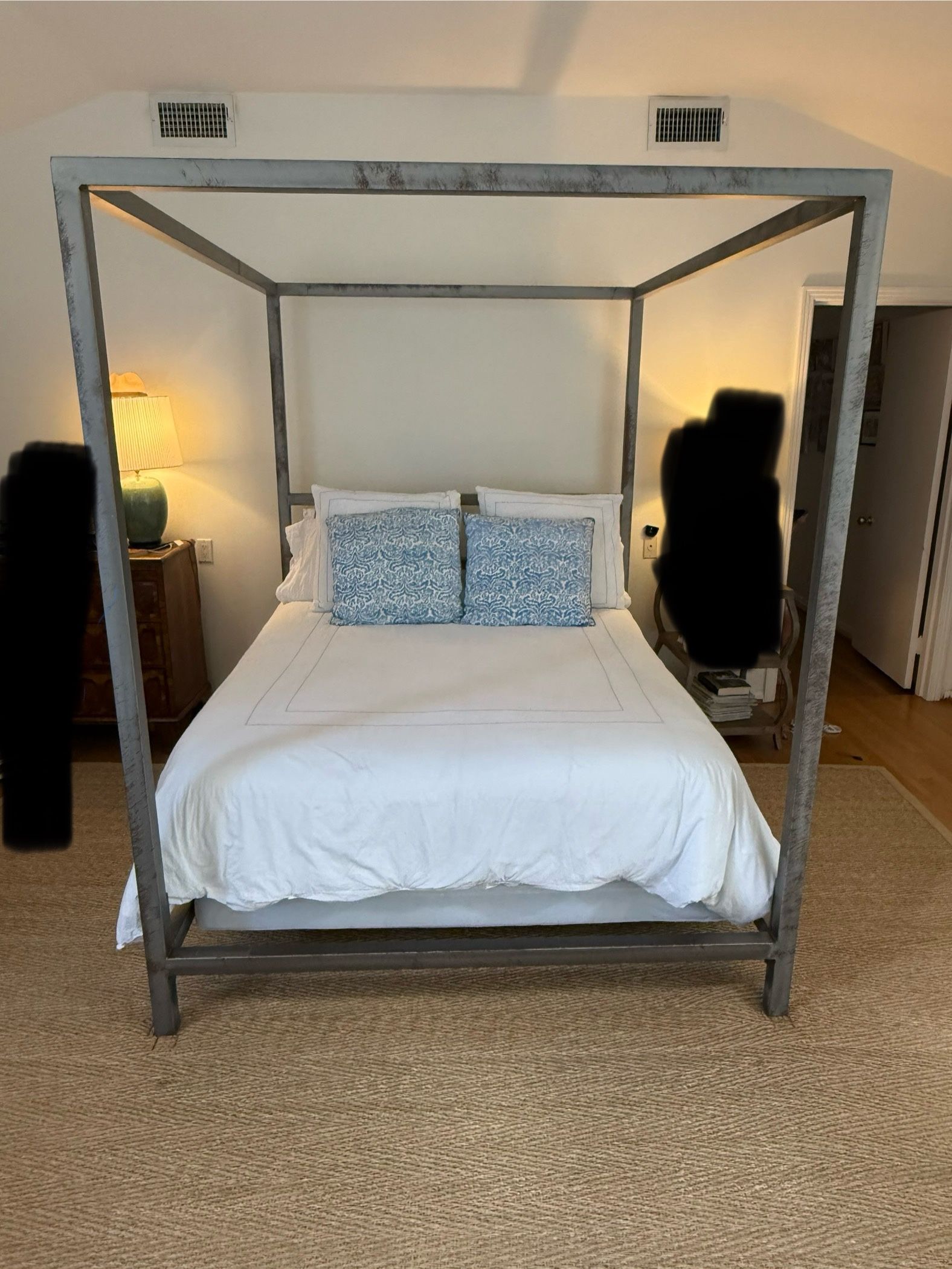 A steel 4 poster queen size bed . Has a little patina to it but is very solid and once put back together very industrial and cool looking! We decided to get a new bed that was bigger since it’s a queen. But it’s a great bed frame and very sturdy!