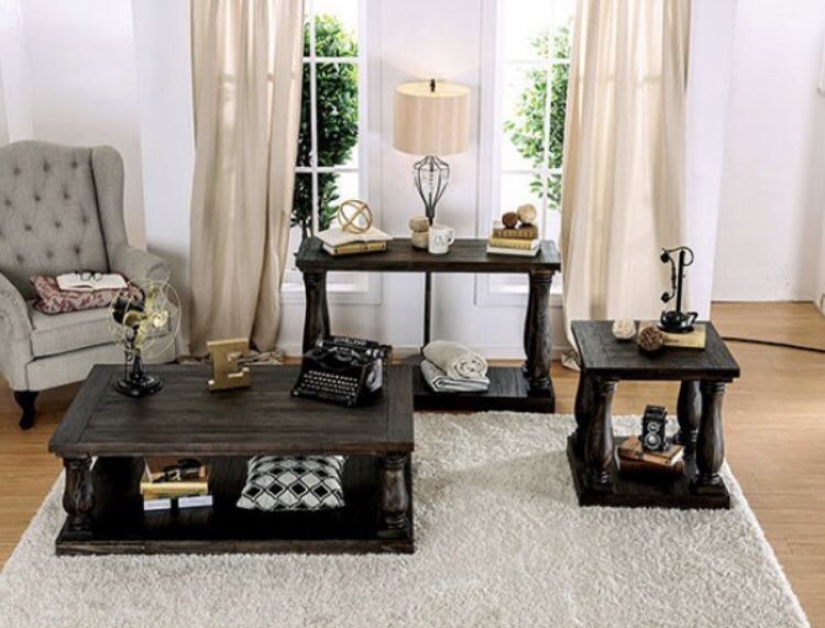 ****SUPER SAVINGS**** Brand New Occasional Table Set Only $1499 Was $1699 Set Includes Coffee Table, End Table, & Sofa Table Solid Wood Finished in Weathered Walnut Open Shelf Rustic Wood Grain Details Lovely Turned Legs Impeccably Inviting Design Coffee Table with Cushioned Top Also Available Perfect for achieving the warmth and charm of a rustic farmhouse. Hablamos Español INCREASE YOUR PURCHASING POWER!!! Easy Approval Credit Check Program w/ 6, 12, 18 & 24 Months Financing SAME AS CASH IF PAID OFF IN 90 DAYS!!! No Credit Check Financing Also Available. Come See Us @ Zoe’s Furniture in Richardson, Texas Only!!! F. Four Four Five Five. Nine Seven Five. CS