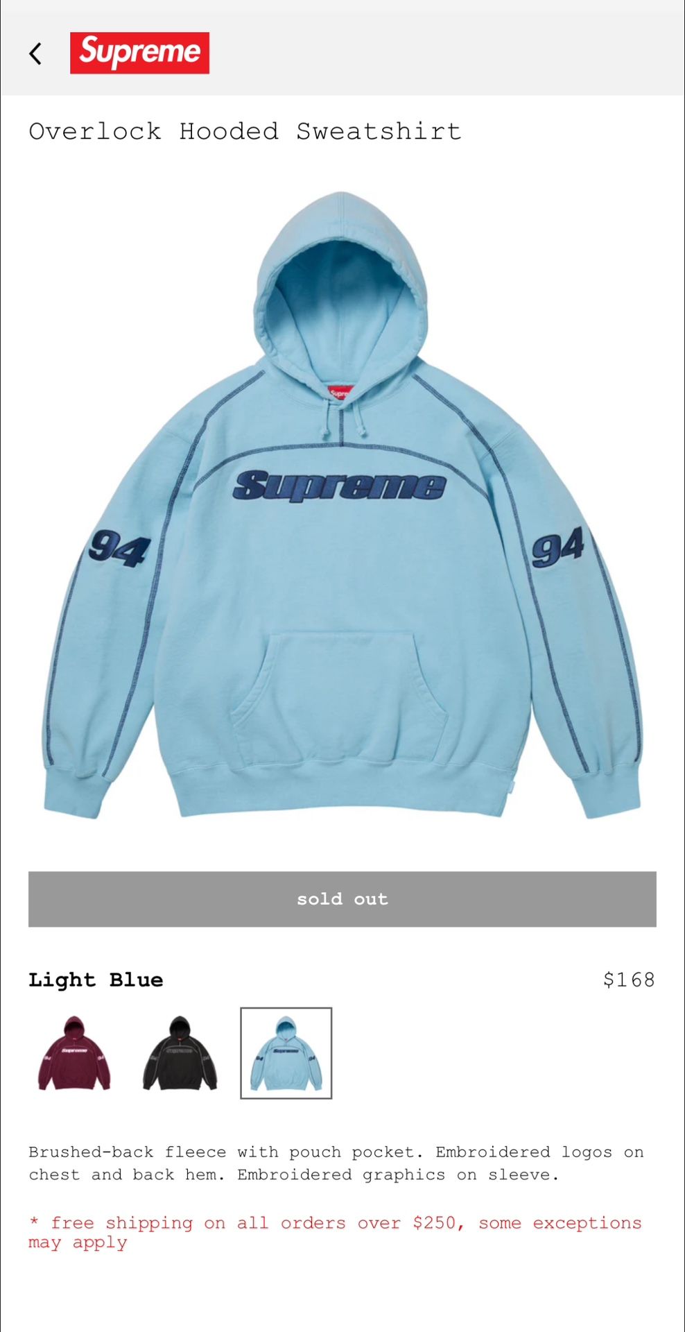 Brand new Sold out Supreme Overlock hooded sweater light blue size small