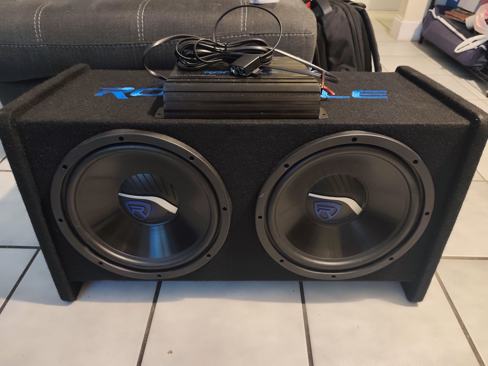 Enclosed 2 12" and 600w 4ohm amp monoblock