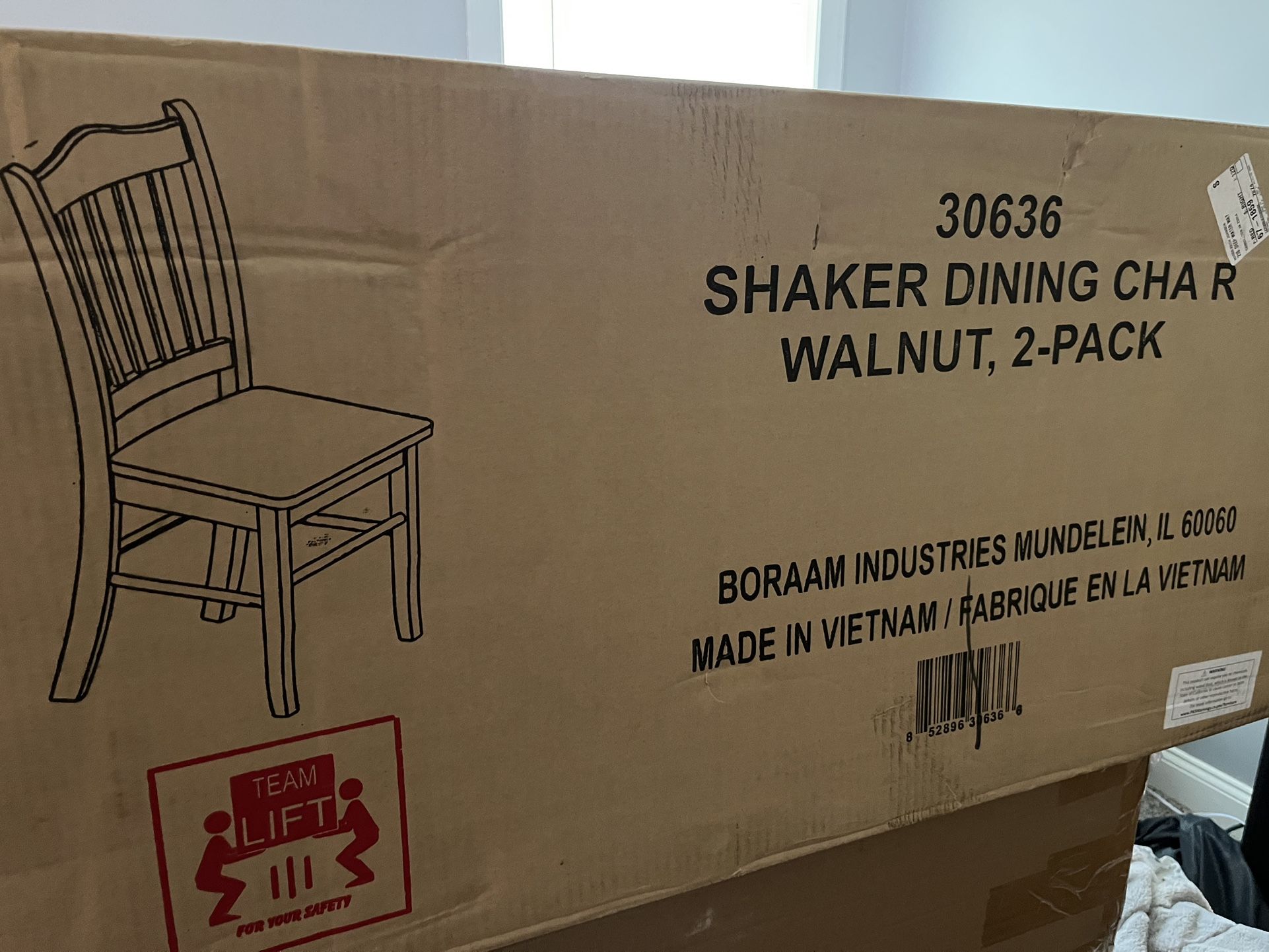 Two dinning room chairs new in box can assemble for an additional 10 dollars