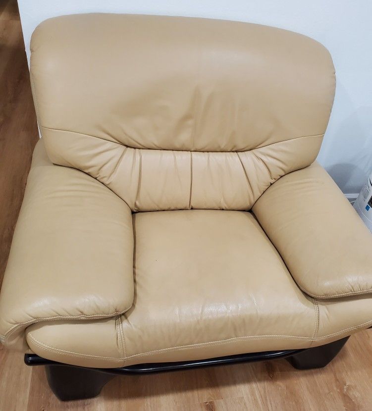Nice real leather. Clean. No stains. Great great condition. Firm cushions.