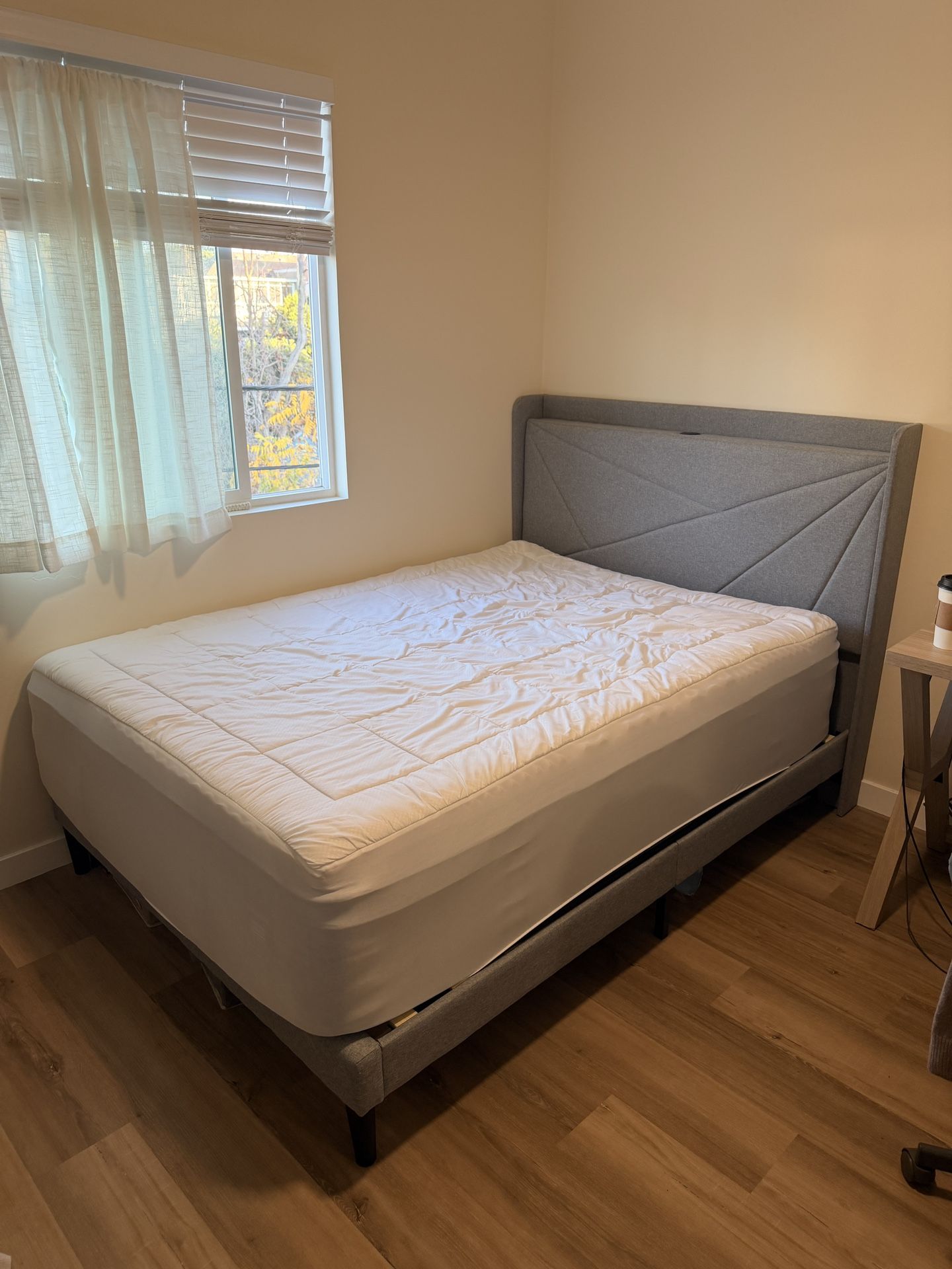 MATTRESS NOT INCLUDED!! measurements in 4th picture - brand new condition - upholstered linen - wingback headboard - plugs into outlet - easy to disassemble and assemble