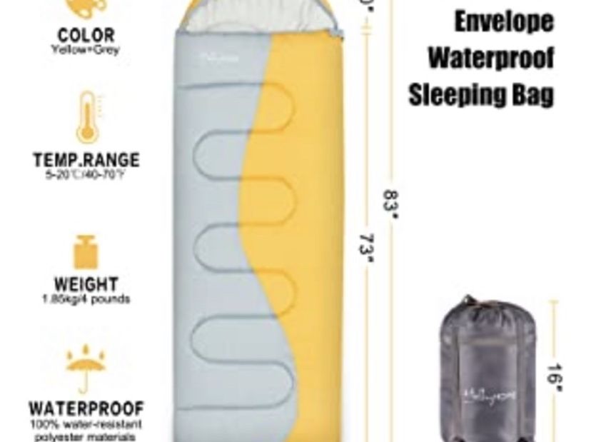 Brand new! More pieces available! 4 Seasons Adult Envelope Camping Sleeping Bag Envelope Shaped: Special envelope shape is devised to keep the whole body warm because of its 360 degree package design. Lightweight: The sleeping bag is protable enough to be taken to anywhere for hiking/traveling/camping. Warmth Retention: Unique Warmth retention design makes you feel warm enough and comfortable even in some cold weather. Water-resistant: High quality Water-resistant cover provide your sleep a clean and tidy enviornment. Specifications ① Shape style: Envelope ② Display Dimensions: 83 x 28 inches ③ Colors: Yellow and Grey ④ Materials: (outer) 230T Polyester; (lining)230T Polyester pongee; (fill) Hollow Fiber ⑤ Temp rating: 0 - 25 Centigrade Degree /40 - 70 Fahrenheit Degree ⑥ Weight: 4 pounds