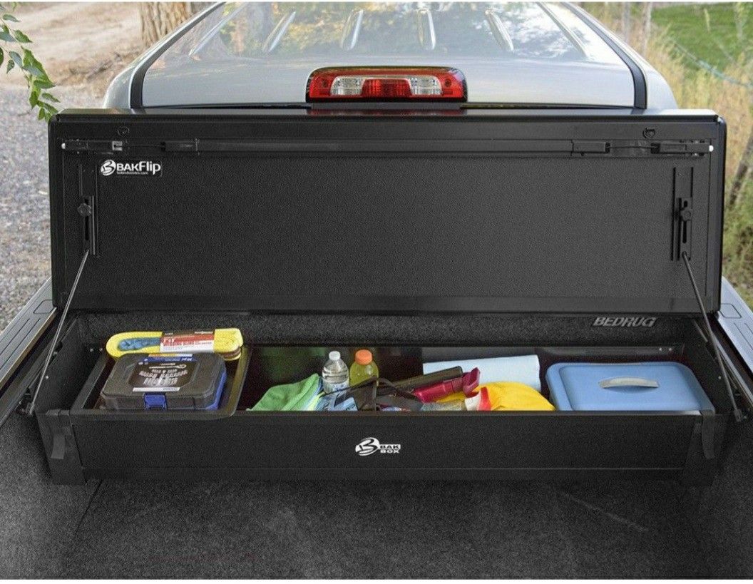 Bak box tool box for Ram 2019-23 The BAKBox 2 is a convenient storage solution designs to work with all BakFlip & BAK Revolver tonneau covers. This versatile toolbox can be positioned anywhere on the rails and fits underneath your tonneau cover. Lock your tonneau cover to secure the contents in your BAKBox. You can also fold up the BAKBox so that it is out of the way, giving you your entire box for other cargo. - Includes a sliding tray for small items - Box dimensions 10" x 10" x bed width - Sturdy no-drill, clamp-on installation - Solid core 1/2" thick FRP composite panels - Designed for BAKFlip and Revolver rails