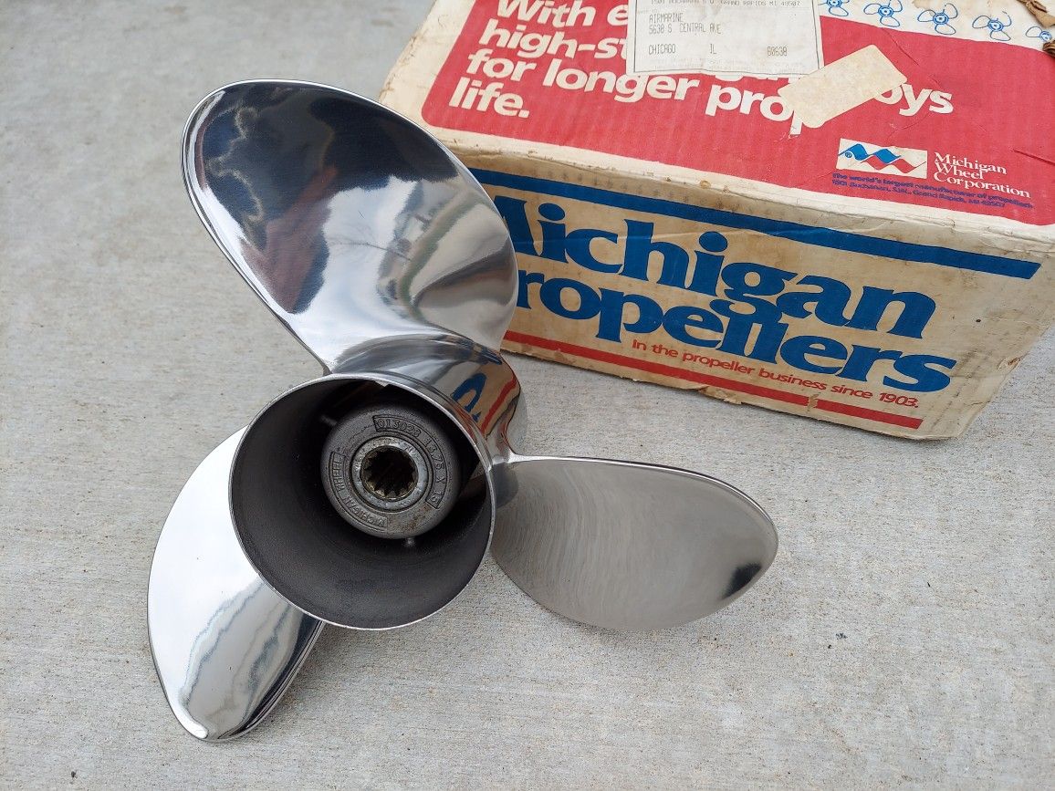 Michigan wheel stainless steel 3 blade prop all the numbers are on the prop brand new never used polished very well-built propeller awesome torque and very heavy Duty new this props around 350 in the store 225 or best offer. Wilfit numerous brands of outdrives stern drives an outboard motors from 40 horsepower up to 150 horsepower