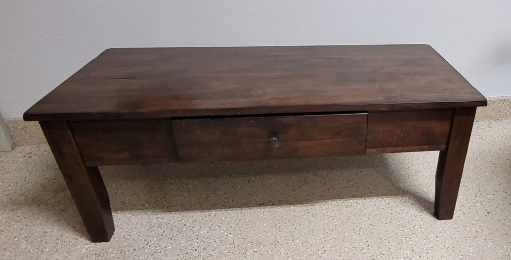 Rustic Wood Coffee Table with Drawer. 48" long, 22" wide, 18" high.