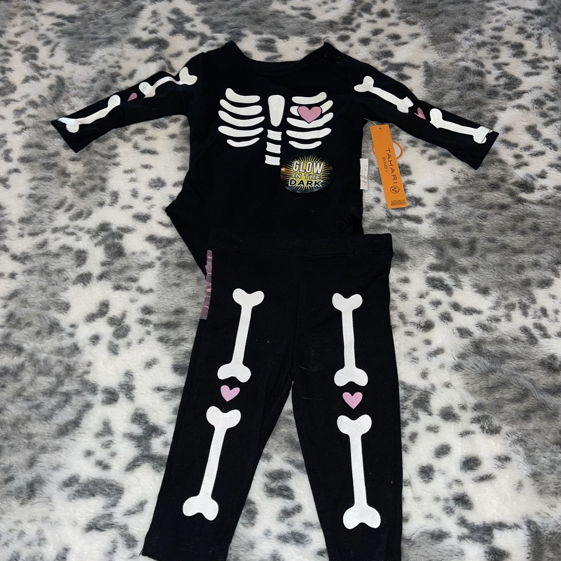 2 piece outfit Halloween themed Bodysuit and pants set Skeleton bones & hearts Back of pants have pink ruffle detailing Size 3-6 months
