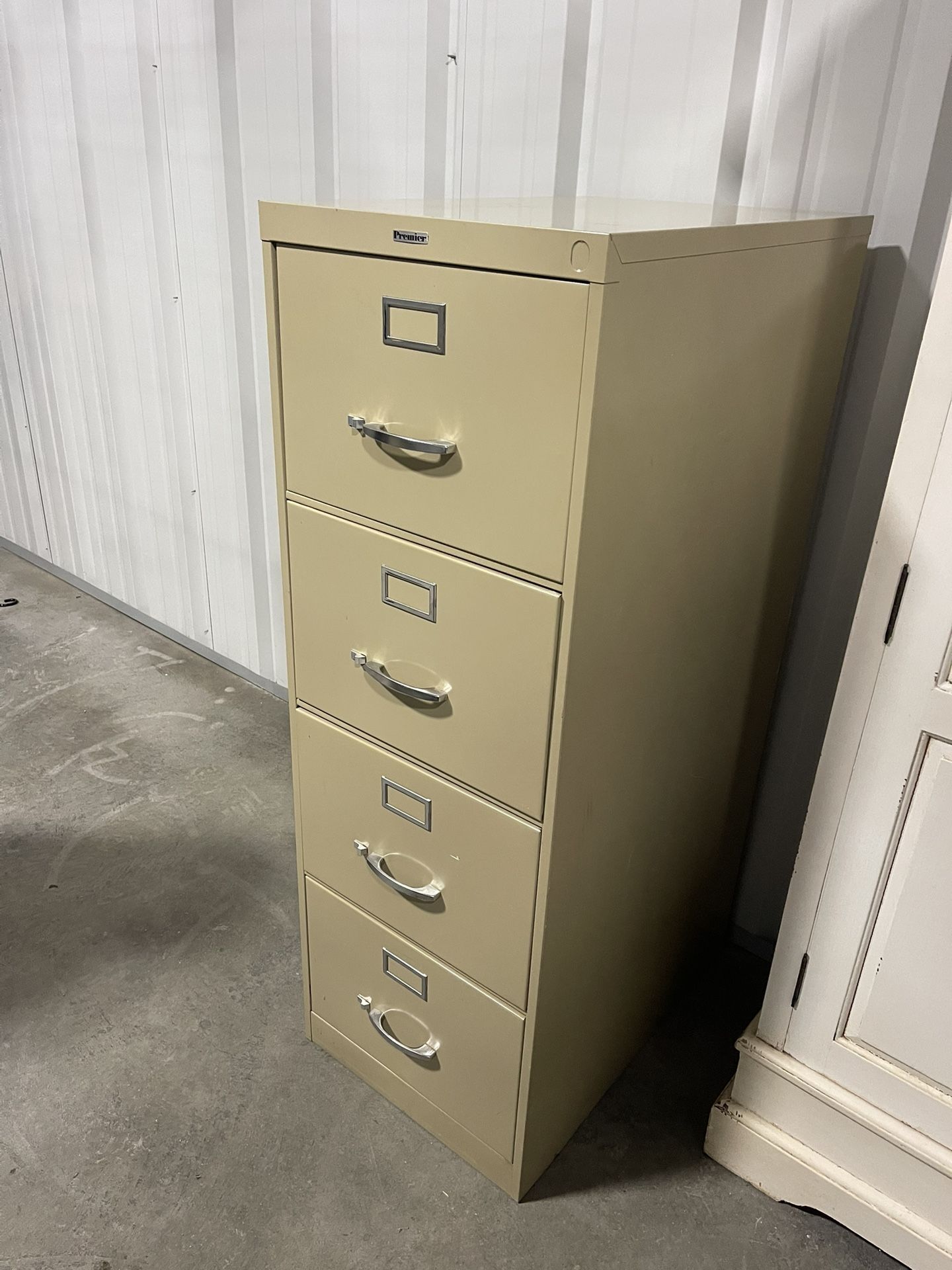 Commercial grade steel file cabinet Premier 4-drawer vertical file cabinet. Pre Owned in great working condition. Please see pictures for condition. Exterior 52 tall 18 wide 26 Deep Interior 16 wide 25 Deep Commercial file cabinet Premier 4-drawer vertical file cabinet. This model appears to be a commercial-grade steel unit Many file cabinets under the Premier brand name are offered by office supply and furniture companies as a durable, commercial-grade storage solution. They are often designed with features like full-extension, ball-bearing drawer slides