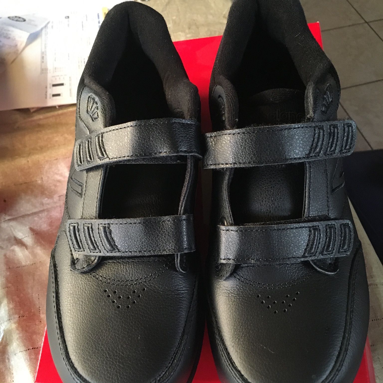 Worn once wrong size too late to exchange . Men’s new balance hook and loop black leather walking shoes. paid $150 this shoe rubs big and will def fit a 9 1/2