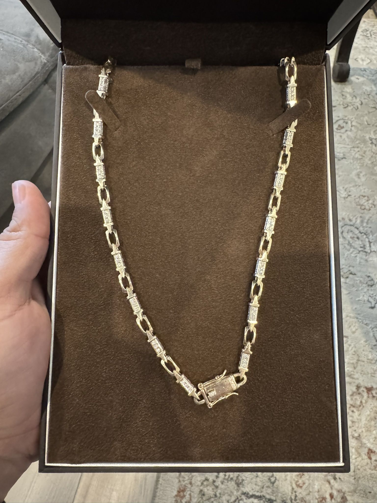 Up for sale solid gold chain handmade by me This is not your typical Cuban link or rope , takes time to make this type of chain every stone is mounted by hand total of 16ct 14k solid gold chain, 59grams ,26” long about 6mm wide No I won’t sell it as scrap gold, I can do modifications in request Igjcjewelers_19 Hablo español