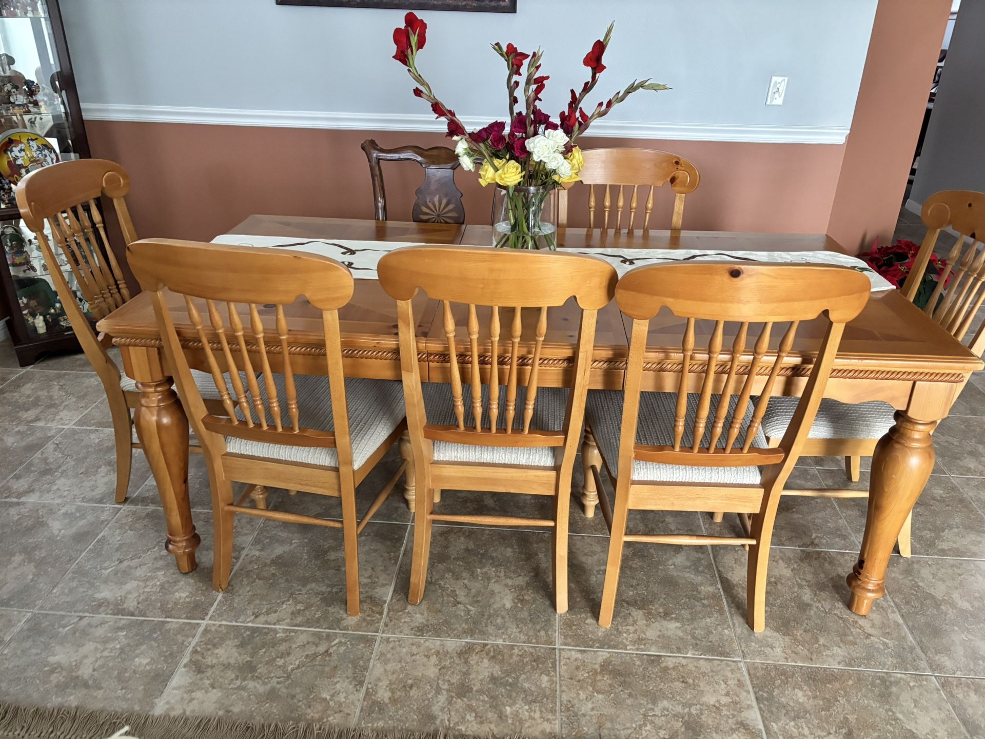 78” long x 40” wide with an 18” extension removable to make table smaller and with 6 chairs . Golden Oak wood color.