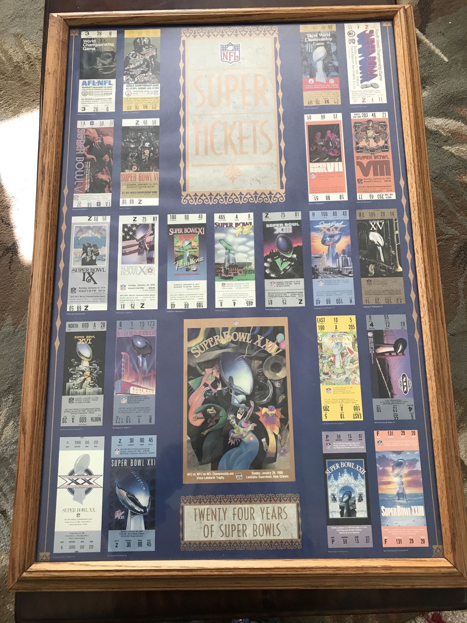 SUPERBOWL PARTY CENTERPIECE Beautiful solid wood framed poster featuring the first twenty four SUPERBOWL games. Large 35” X 24”