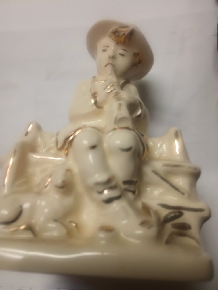 Unique vintage haeger porcelain boy flute lamb porcelain container... excellent condition... ready to ship