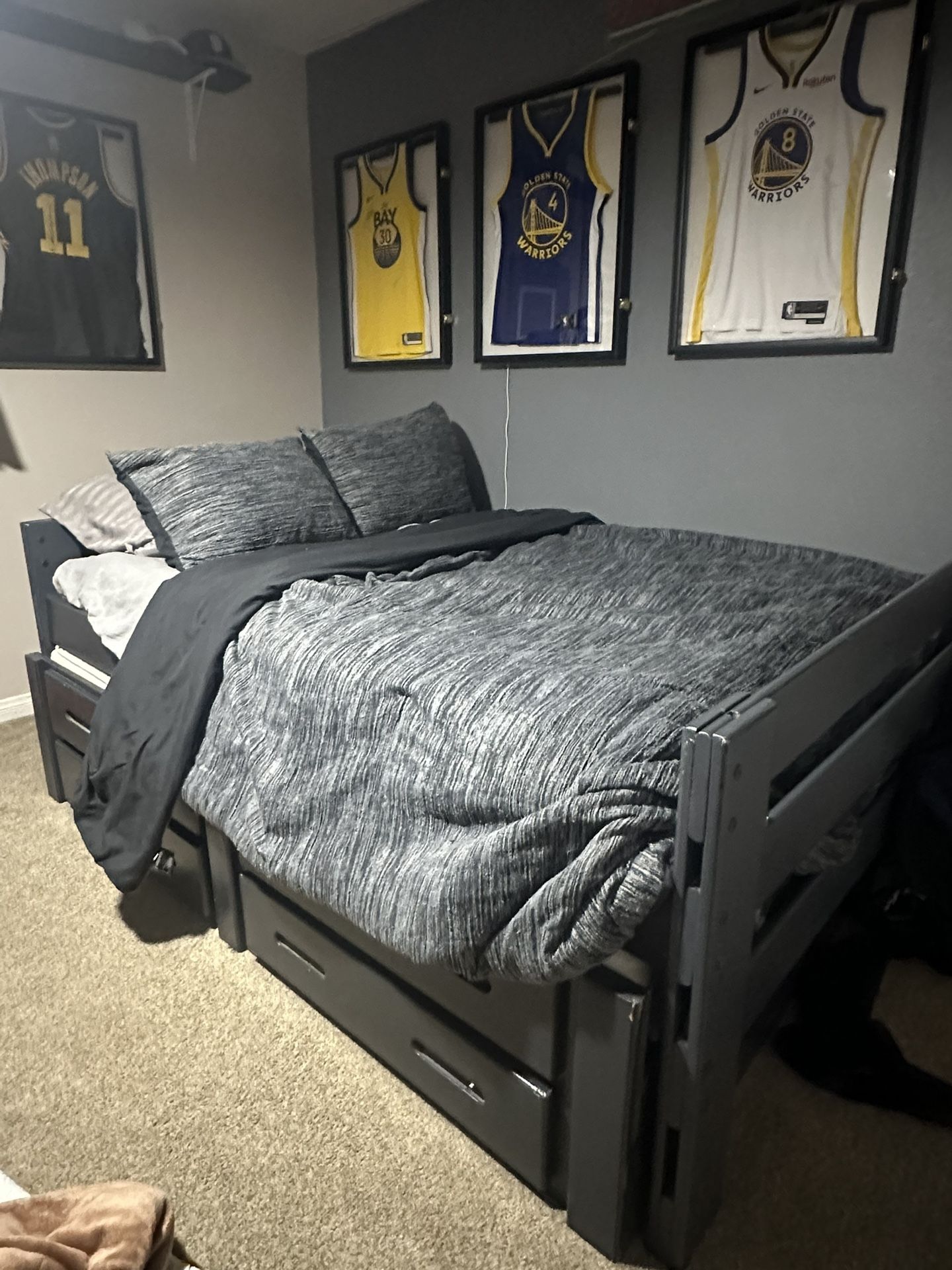 Gray wooden full bed with twin trundle and two drawer storage. Bed frame only and must be picked up.