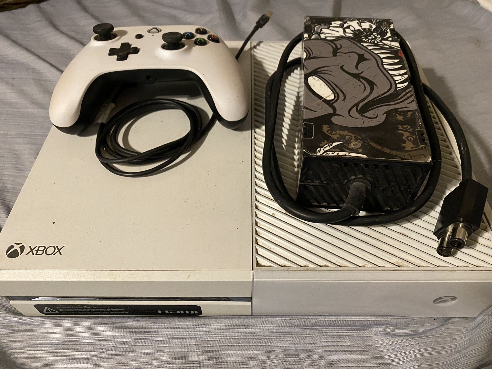 Excellent condition white Xbox One console. Works perfectly. No flaws at all. Factory reset and ready to be used. Some dust but I will clean off before meeting. Comes with power supply cable hdmi cable and wired controller. Also comes with friday the 13th game disc not pictured. Open to trades. Make me an offer