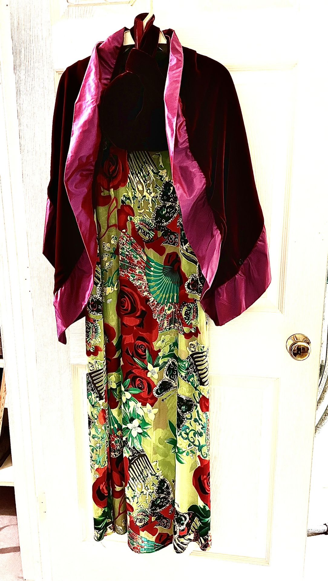 Dress is one size, fits most, made of a silklike material. Bright array of bold colors make this dress ensemble perfect for a Caribbean cruise or a night on the town that includes a velvet shawl for those cool nights along with a matching velvet purse. This new ensemble has never been worn. Price tag still attached.