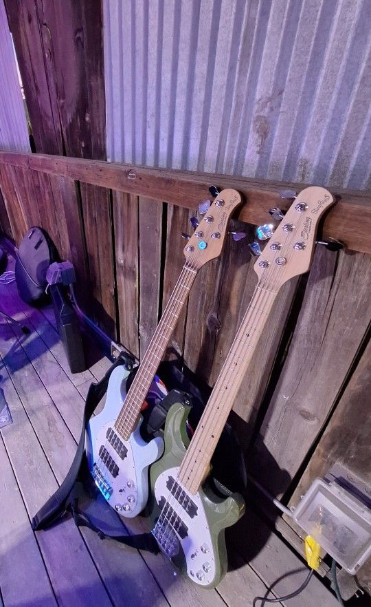 The green one is for sale with Ernie Ball locking padded strap and gig bag. Great 5-string bass ready to gig.