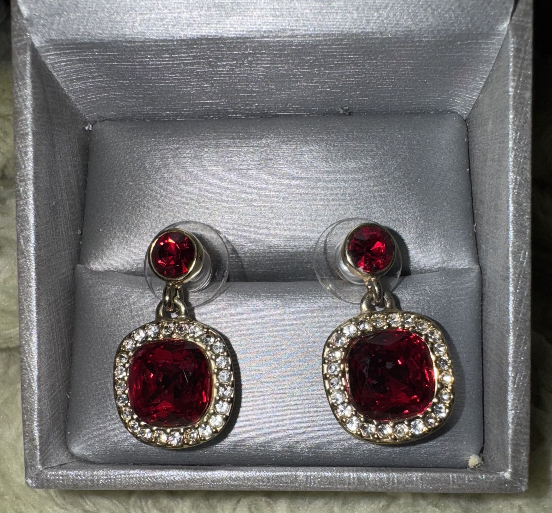 These are a pair of elegant Givenchy crystal drop earrings, featuring a prominent red, cushion-cut main stone surrounded by smaller clear accent crystals, all set in a gold-tone metal. The earrings dangle from a smaller, round red stud, secured with a post-back. Signed.