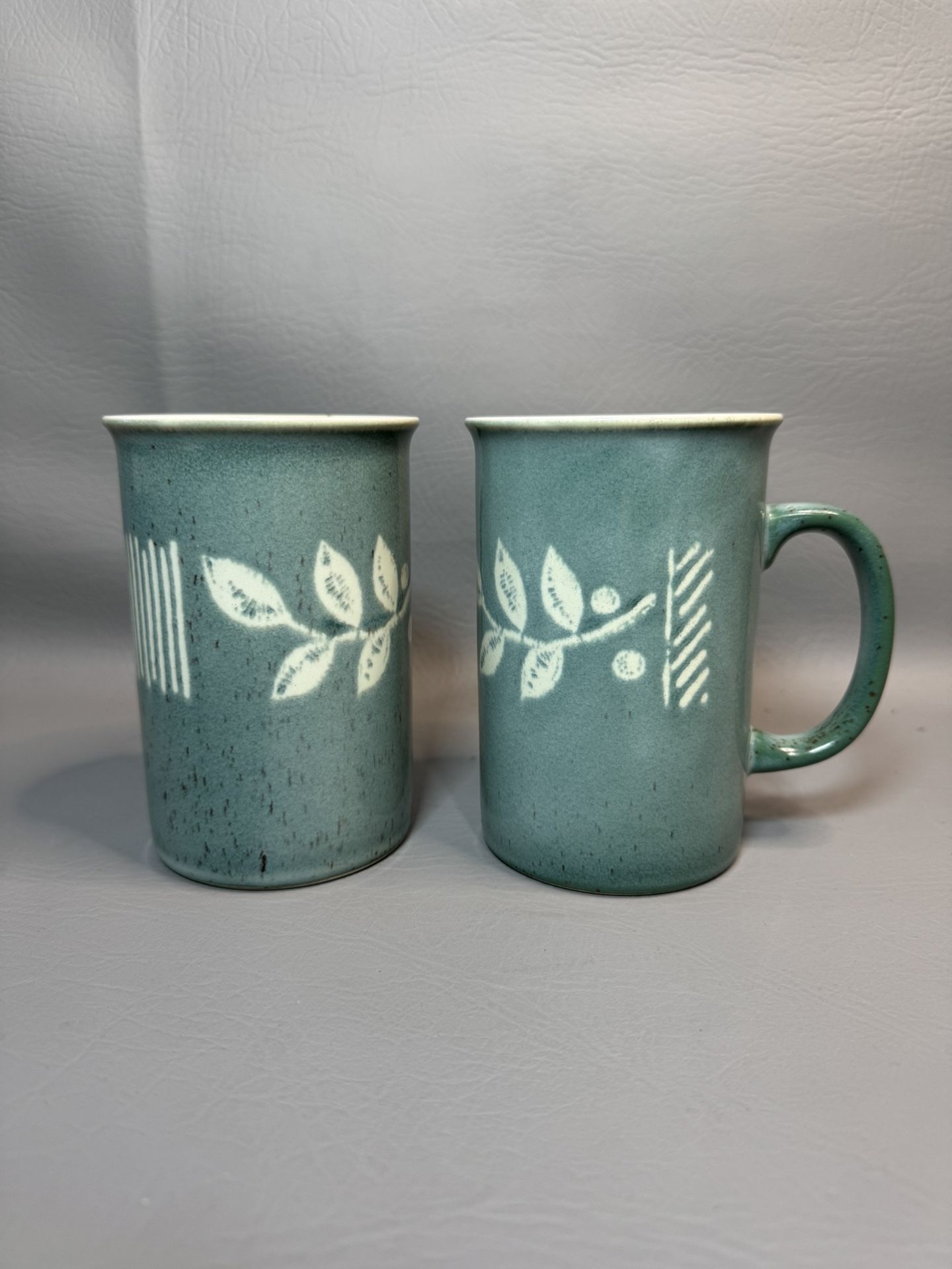 Mikasa Set/2 Tall Coffee Tea Cappuccino Latte Mugs Gourmet Cup 14oz Potters Craft 5” tall Sage Green Has spot on rim on one cup as shown in pic Obvious marks inside cup as shown in pics