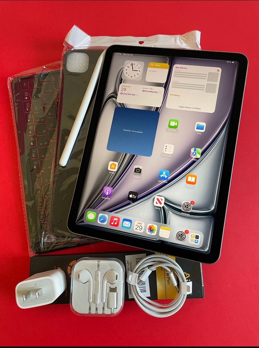 Apple Air 11” ( M2 chip) ( 2024 Model) 128GB Memory Wifi only model Slightly used / good condition 100 % Battery Health Clean / unlocked Ready for new user 11” Liquid Retina Display 128GB Memory M2 chip / powerful processor Quad (four) speakers 4K video shooting supported Latest IOS 18 updated Ideal for school / college student / office / business / video editing/ professionals / light gaming / tattoo Artist etc Comes with *New Fast charging Type C cable *New Fast Charging 20w power adapter *New wired headphone *New stylus pen (Ailun brand) *New Folding Bluetooth keyboard case $499 firm firm (no less) Cash only (No trade) Pick up only (El Monte) Meet up public place near me You are welcome to test / try it before you pay. Apple IPad Air 11” ( M2 chip / 2024 Model) 128GB with pen, keyboard case & Accessories