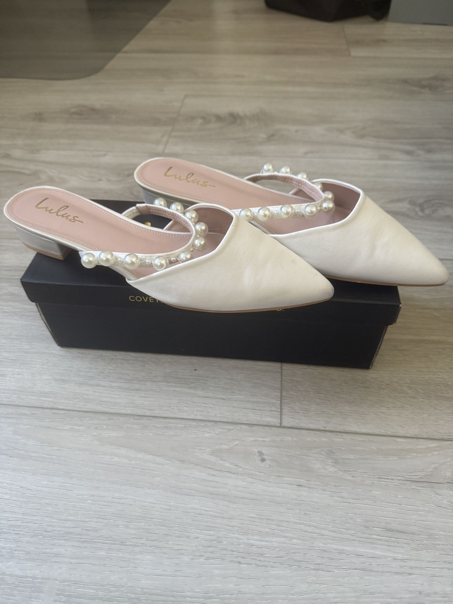Lulu’s Hershie White Satin Pearl Pointed-Toe Mule Slides. Women’s size 10. Runs a bit wide. Originals prize $50. Worn once. Good condition just needs to be cleaned.
