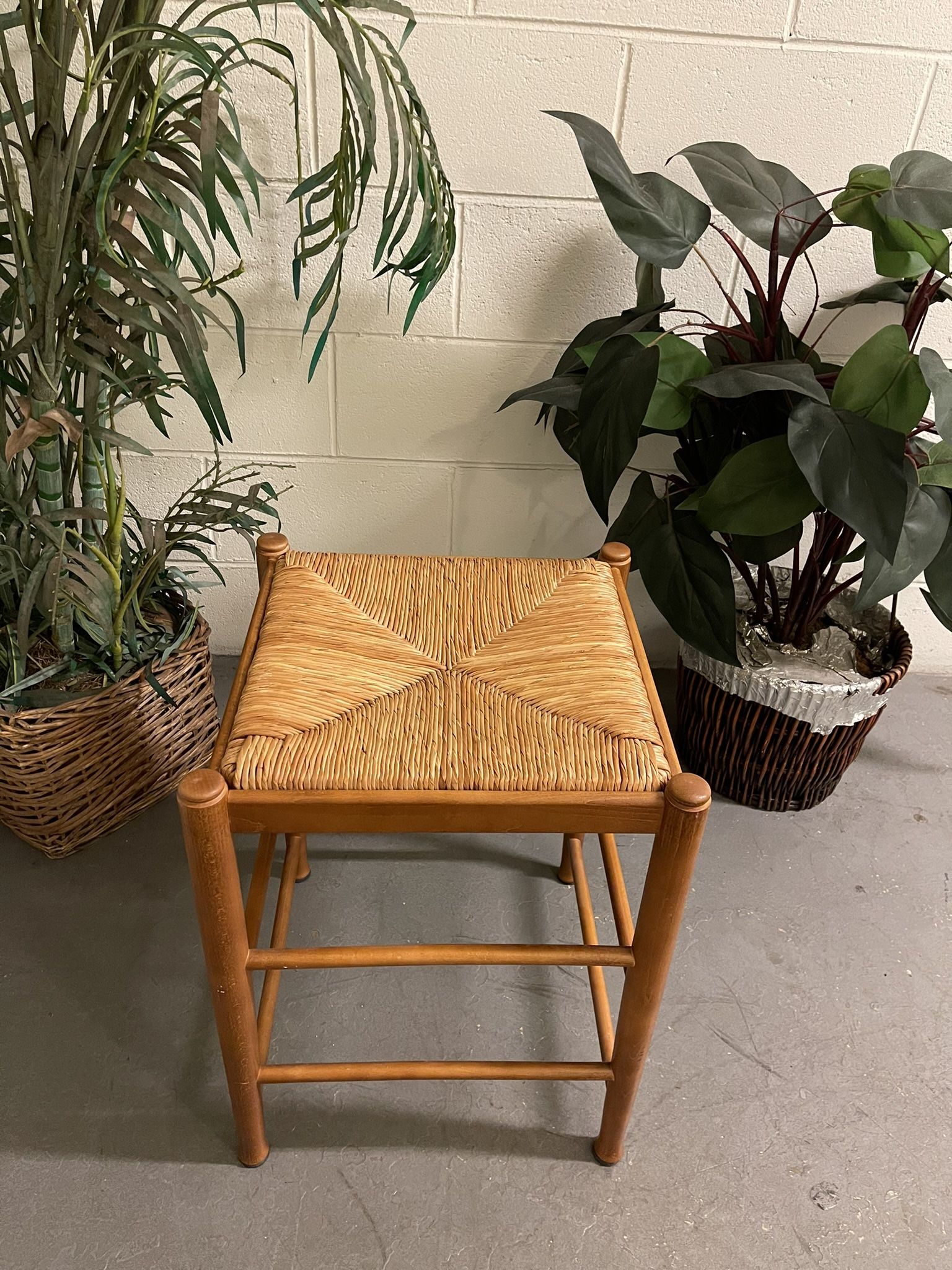 EARLY-AMERICAN-STYLE WOOD STOOL w/NATURAL REED SEAT. DIMENSIONS: 21.5" High x 16.5" Square WEIGHT: approximately 10 lbs. BLONDE WOOD STOOL. Natural REED SEAT. Strong & Sturdy. Excellent condition!! PRICE: $30 (firm). CASH only. PICKUP only. Thank you!!