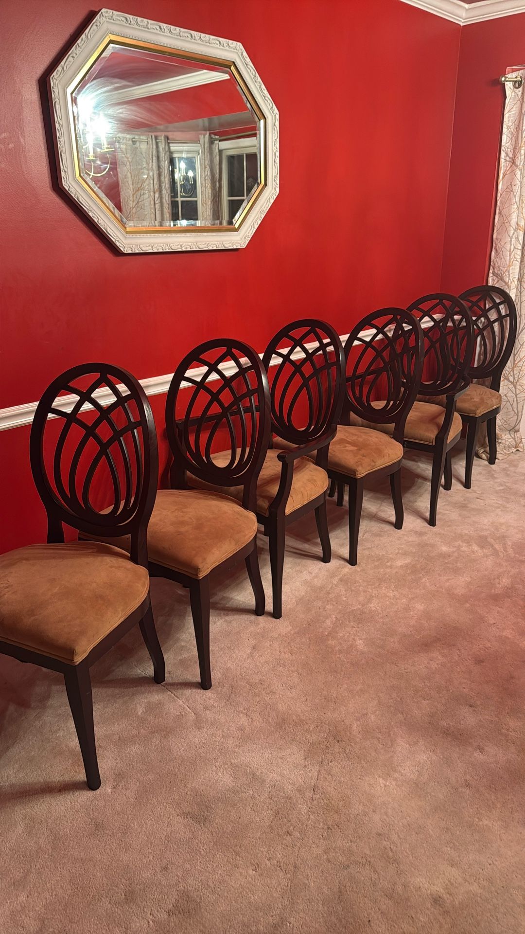 6 dinning chairs. Some scratches and chair cushions could use cleaning. Good quality solid wood. 4 reg and 2 end chairs.