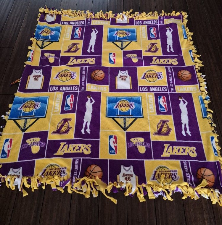 Handmade Purple & Gold Basketball Themed Double-Sided Tie Blanket (46" x 51") This is a "no-sew" knot style blanket, crafted with care to be extra thick and warm. It features a fun purple and gold basketball theme Double the Warmth: Made with two full layers of high-quality microfiber fleece. It's much heavier and warmer than a standard store-bought throw. Handcrafted Detail: Features a decorative hand-knotted fringe border all the way around. Perfect Size: Measures 46 inches by 51 inches. Great for a lap blanket, a child's bed, or keeping in the car for travel. Easy Care: Machine washable (cold) and dryer safe (low heat). The microfiber is durable and stay-soft.