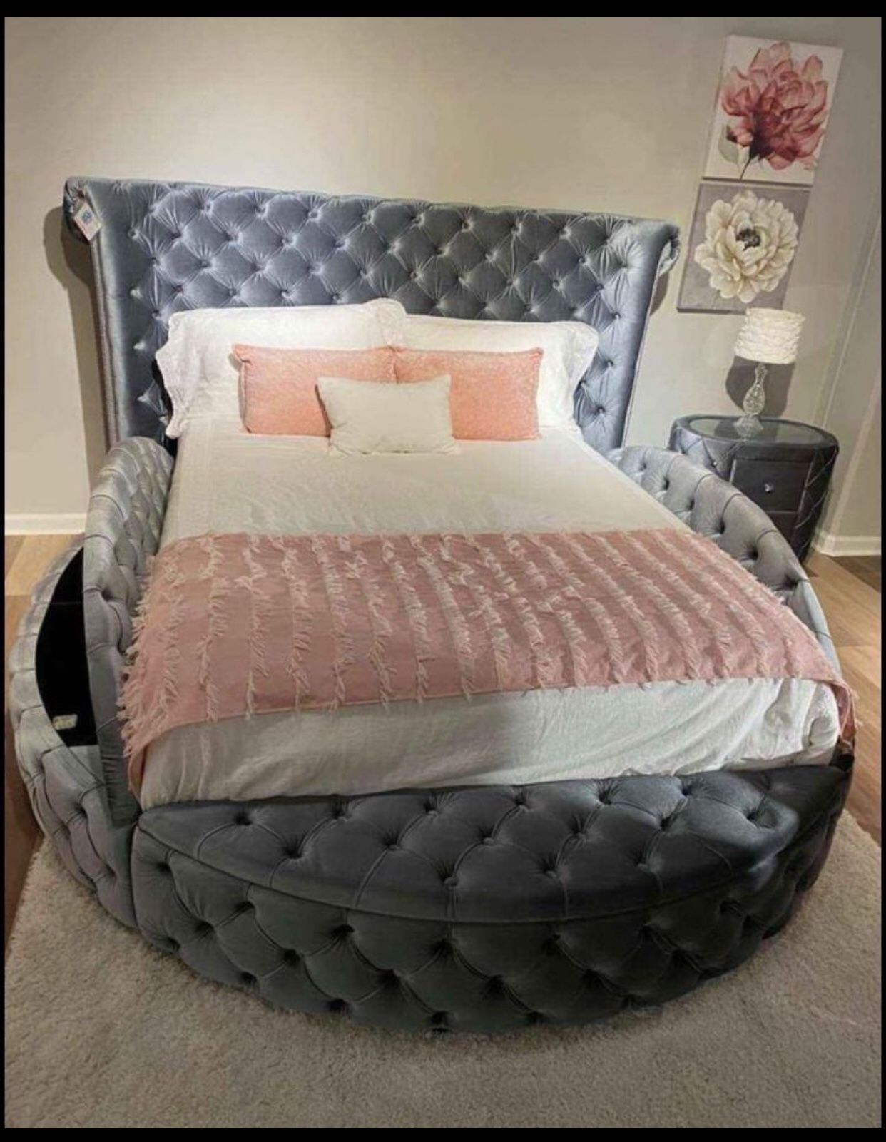 Gray Velvet Solid Wood Round Queen Bed With Storage ✅ Brand New 💥 In Stock 👍
