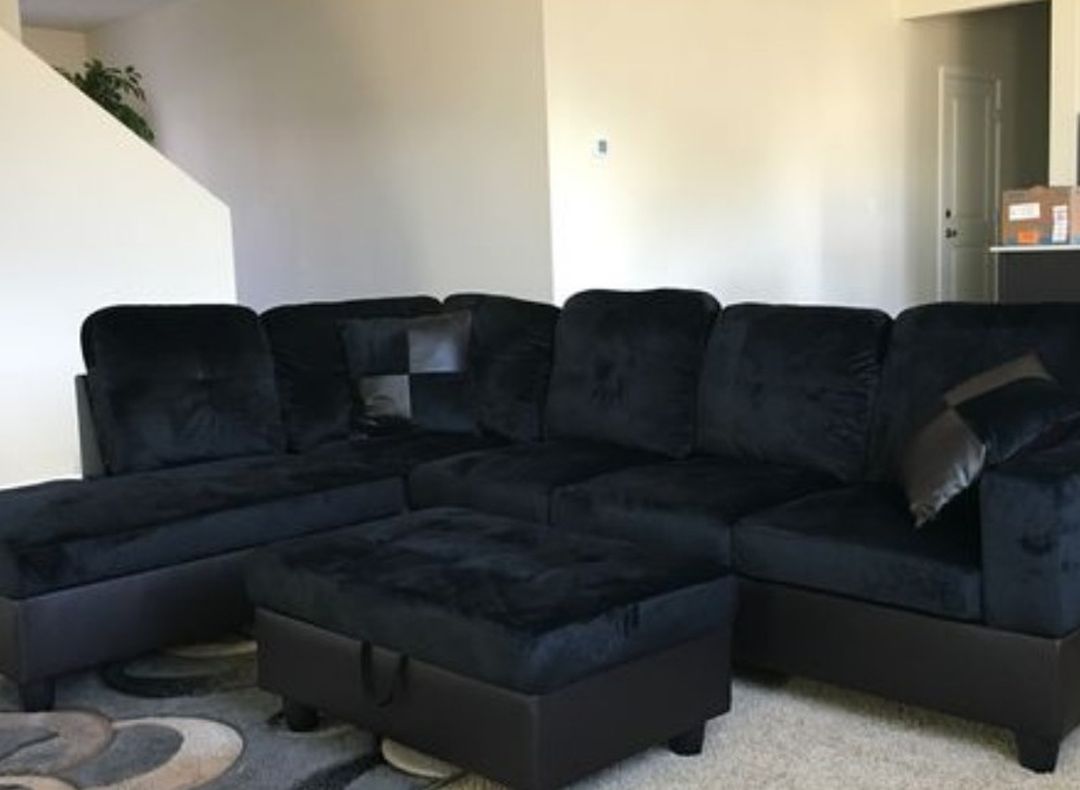 New Sectional with Storage Ottoman at only $620 ( NEW IN BOX. ) " FREE LOCAL DELIVERY " Overall dimensions 103x74x35"H Sofa. 71 1/2 x 32 x 35" H Chaise 74 1/2 x 32 x 35" H Ottoman 37 x 24 1/2 x 16 1/2" H