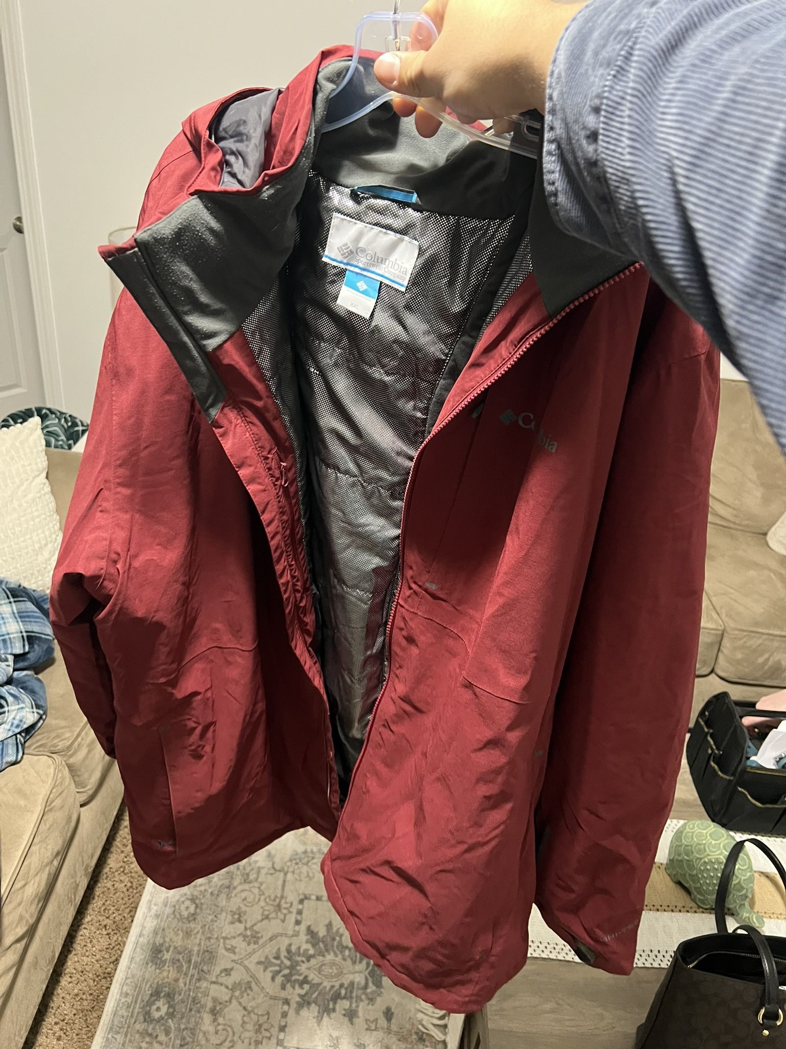 Men’s Columbia snow jacket / winter coat in a red-burgundy color. Size XXL. Designed for cold weather, snow, and winter conditions—great for skiing, snowboarding, or everyday winter wear. Warm, wind-resistant, and water-resistant outer shell with an attached hood. Comfortable fit with room for layering.