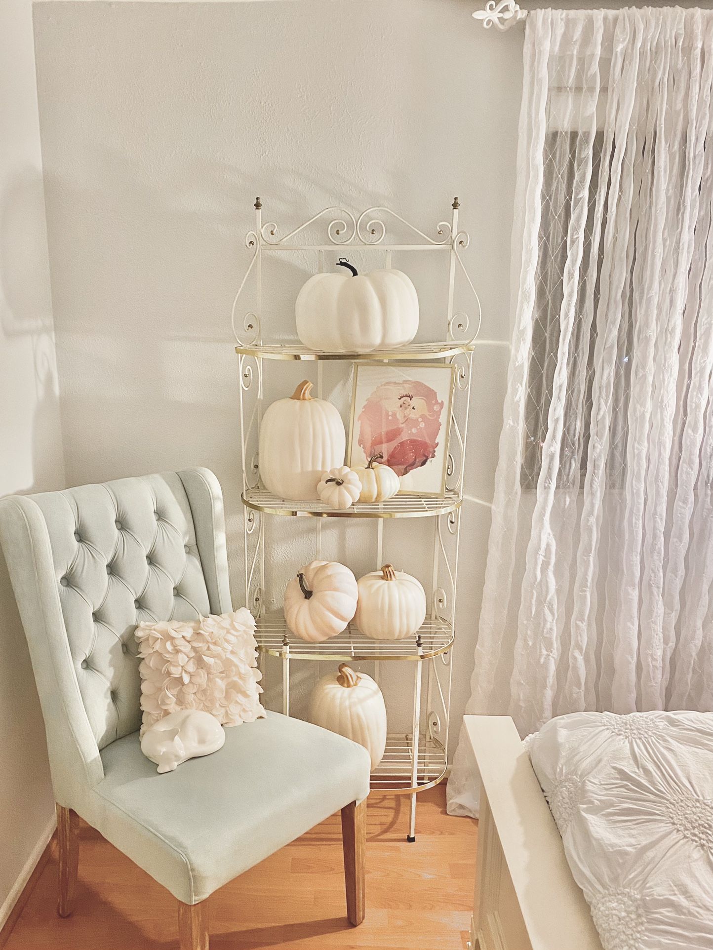 Vintage Wrought Iron Bakers Rack or plant stand - white with gold trim. Very darling scroll curves. Perfect for shabby chic or french country or colonial style home decor. Could be used in a baby nursery or little girls bedroom or kitchen. Willing to accept offers if it goes to a good home :)