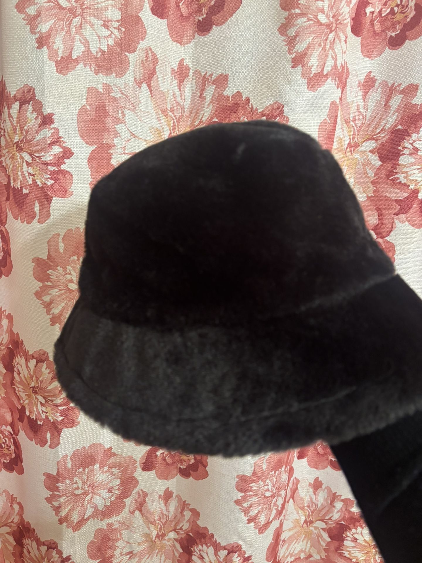 Stylish black bucket hat soft and fuzzy texture. One size fits all however runs a little bit small. I am plus size didn’t fit me that great but a smaller person it would probably fit good. Brand new from Shein . Never been worn no tag , 100% percent polyester.