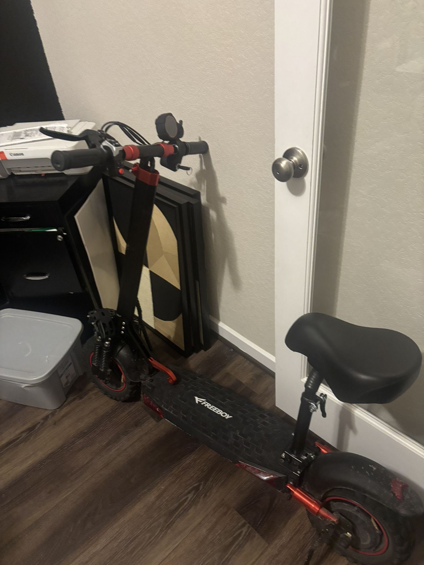 The head light is broken off but still attached to the scooter by the wires & works. The right handle brake is broken, the other is fine. the scooter rides perfectly fine but has a noise when it rides but still goes up to 34mph just needs fixing. Still very good and running