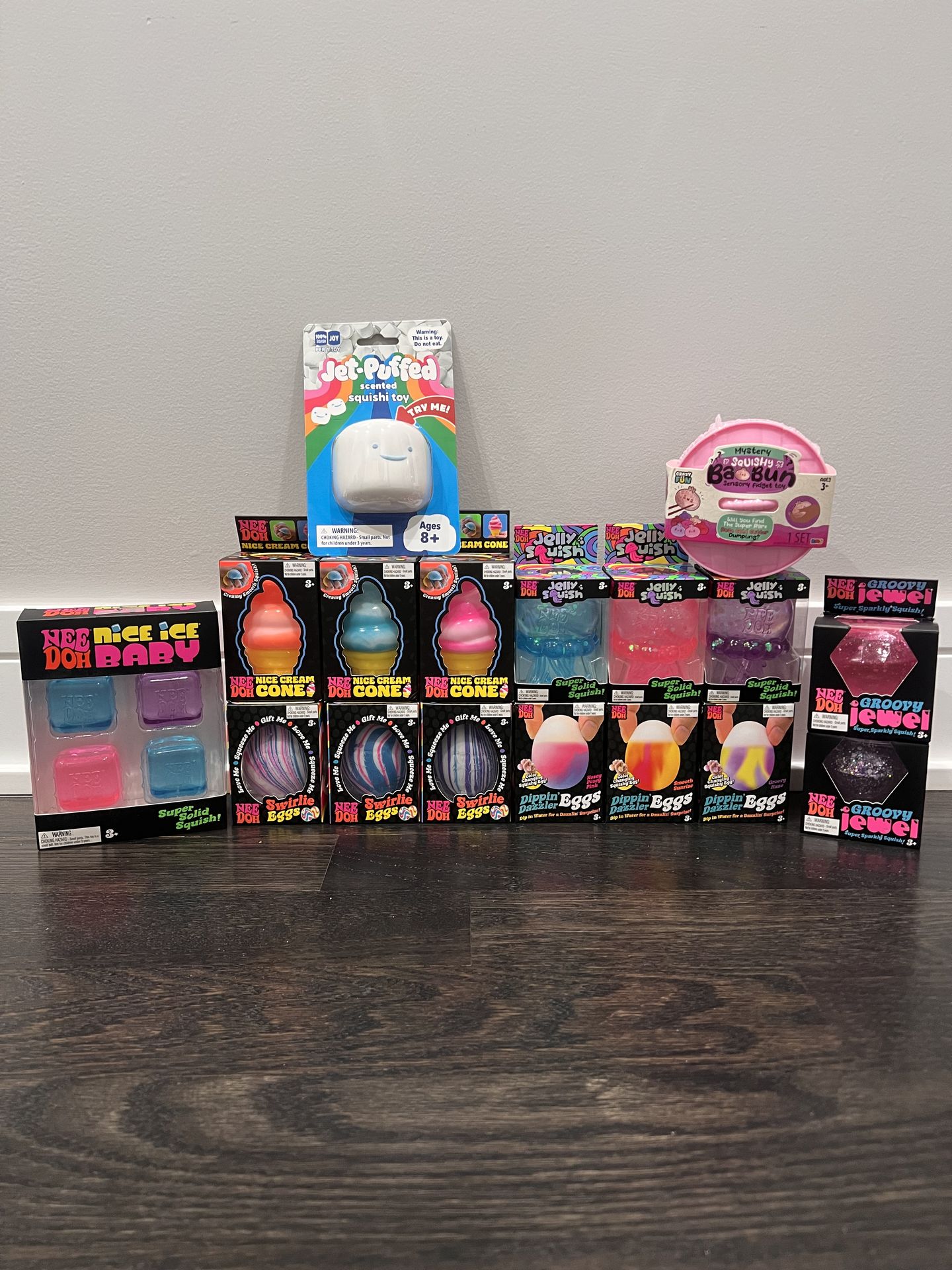 Multiple of everything shown in the pictures are available! Please don’t hesitate to ask if you’d like any other nee doh or squishy! The more you buy —-> the less you pay! Prices for everything here(subject to drop if multiple of any item(s) are bought): -Ice cream cones: $30 each, full set $80 -Jellyfish: $30 each, full set $80 -Mini Nice Ice baby (4): $20 each -Dippin’ Dazzler eggs: $20 ea., full set $50 -Groovy Jewel: $15 each -Swirlie Eggs: $20 each, full set $50 -Squishy Bao Bun Dumpling: $25 each -Jet Puffed Marshmallow: $20 If you have any questions or offers please feel free to send me a message! I’ll get back to you as soon as I can!