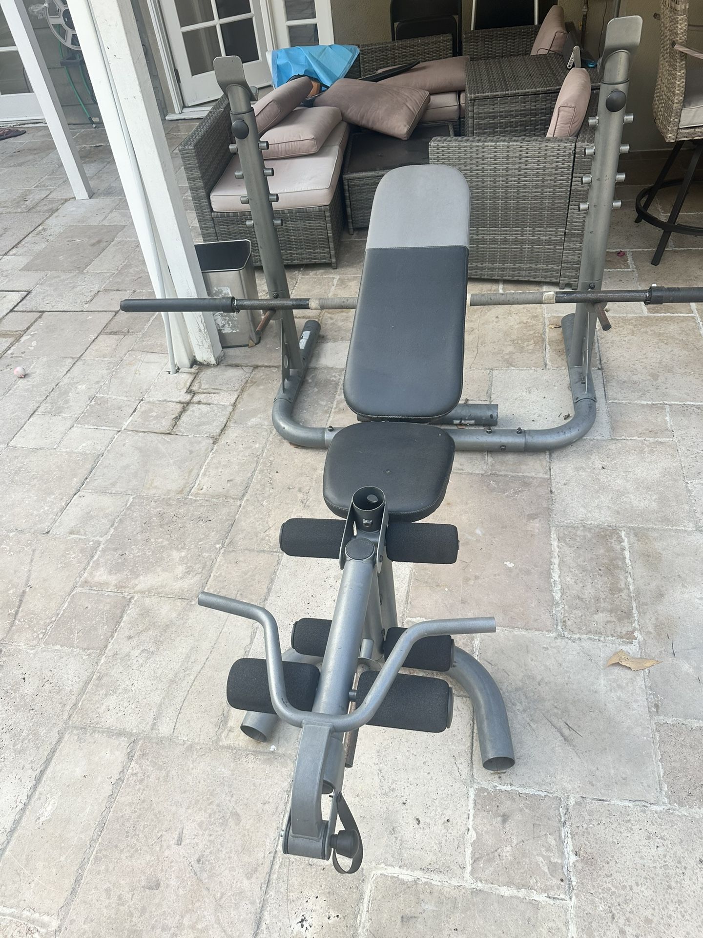 Includes: Olympic barbell, adjustable squat rack, adjustable bench with leg extension