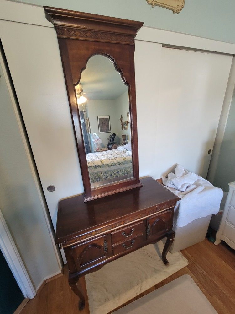 Not sure of the manufacturer. Sizes are in the pictures. Beautiful piece, but I have nowhere to store it.