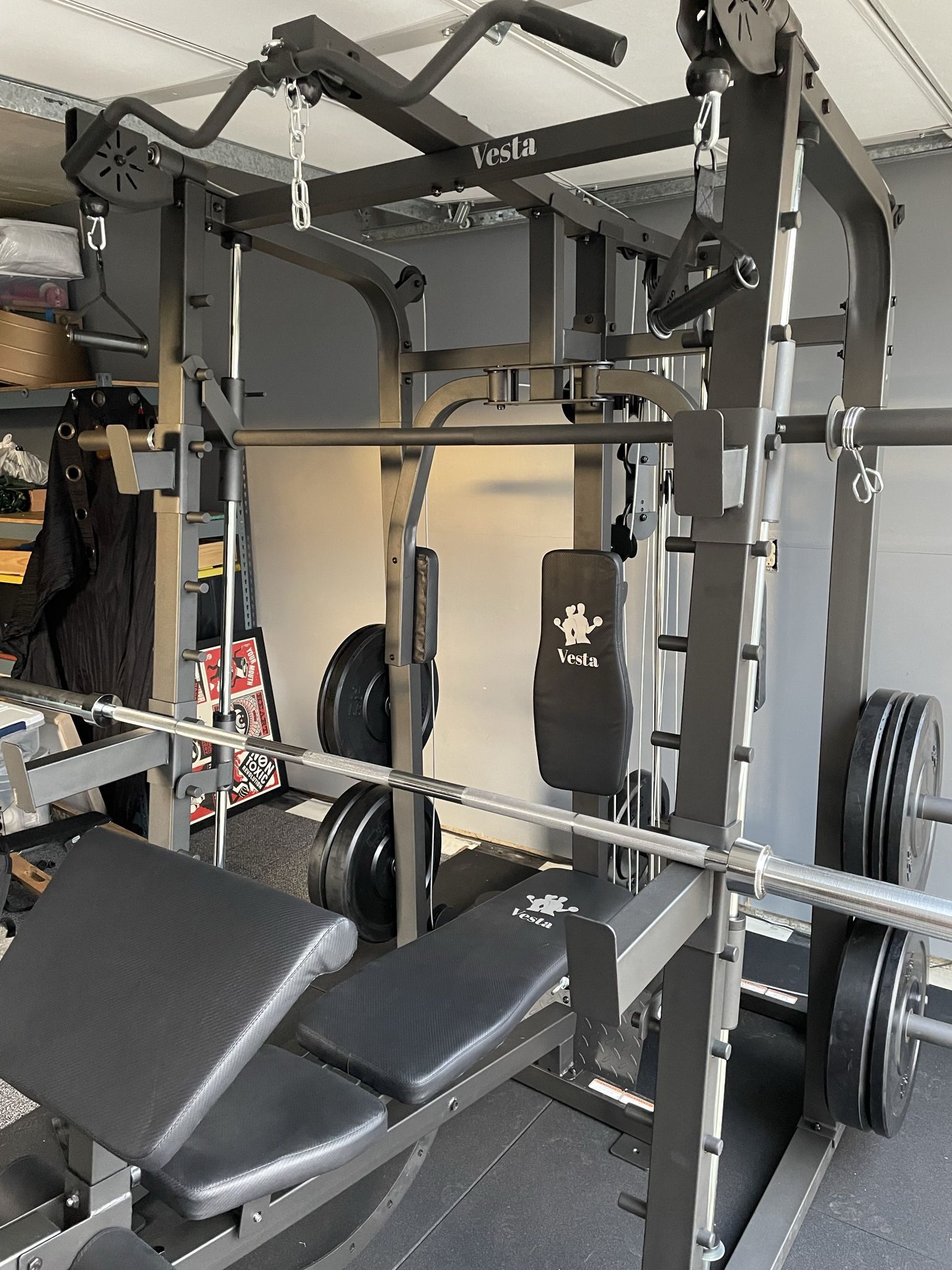 Vesta Fitness Smith Machine 2001 w/Bench Attachment | 230lb Bumpers Weights | 7ft Olympic Bar | Fitness | Gym Equipment | FREE DELIVERY 🚚