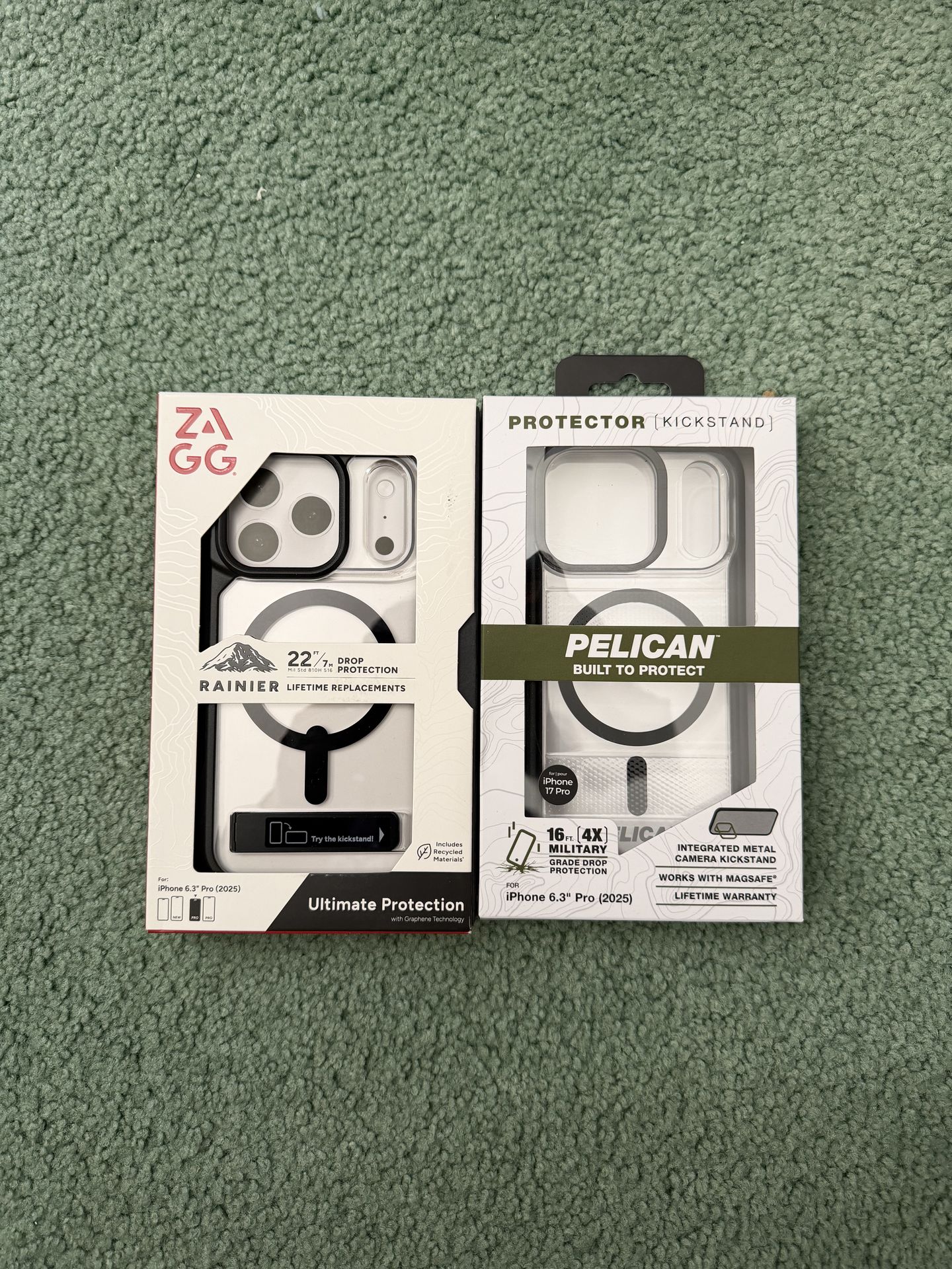 Selling two brand new iPhone 17 Pro (6.3”) protective cases. Both are high-quality brands known for strong protection. Included: • ZAGG Rainier Case – 22ft drop protection, MagSafe compatible, kickstand • Pelican Protector Case – Military grade protection, MagSafe compatible, metal camera kickstand Both are new in box and never used. Perfect if you just got a new iPhone and want premium protection without paying retail price.