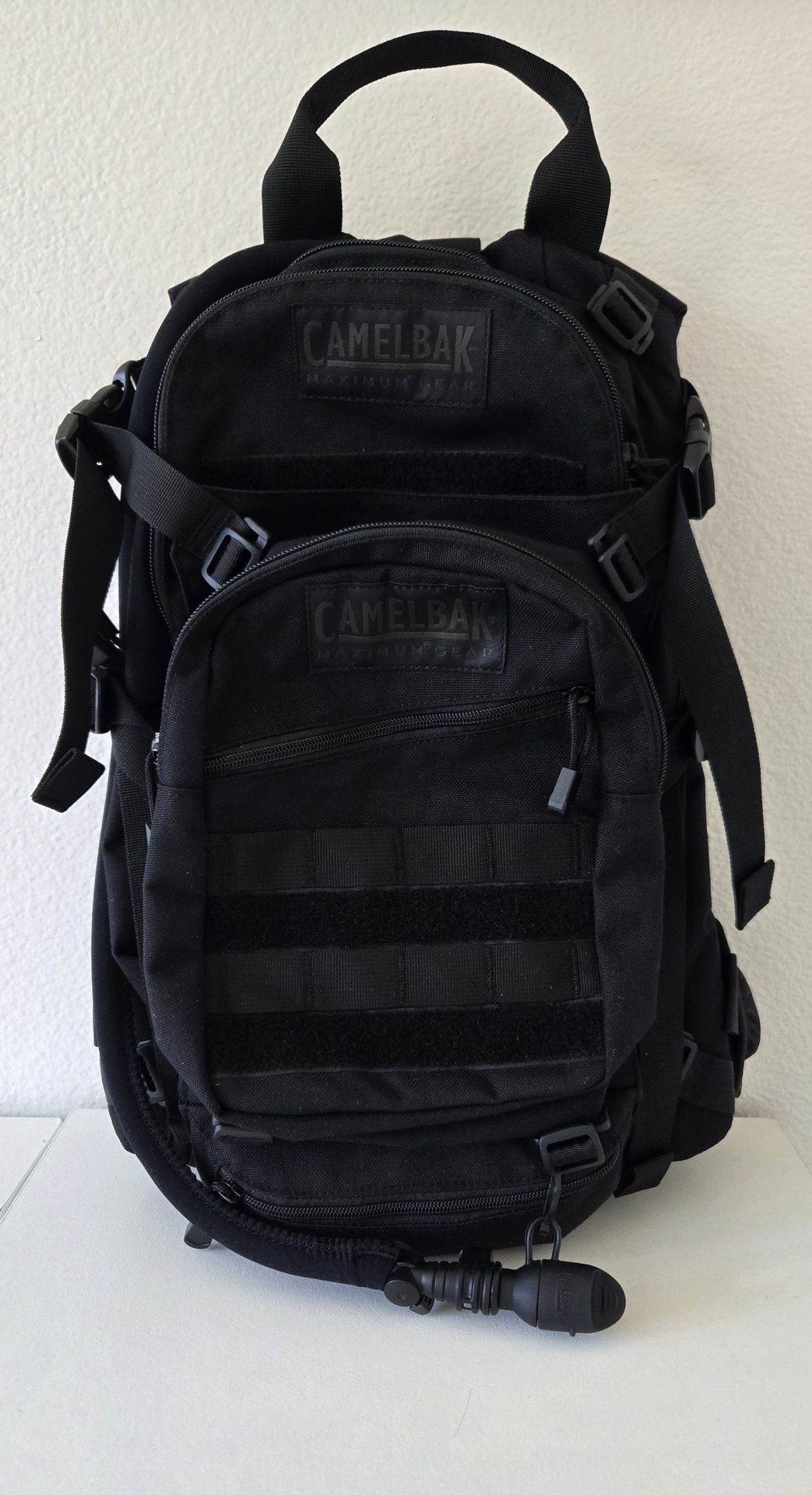 This is a brand-new and full-kit CamelBak Maximum Gear Transformer, one of the most sought after discontinued tactical packs (2022 production). Designed for military and law enforcement personnel, the Transformer features a modular load carriage system that allows the user to remove or reconfigure the two front cargo pockets for mission specific profiles. The pack is built from heavy duty tactical grade nylon with reinforced stitching, hydration routing on both shoulders, and full MOLLE compatible attachment points. Inside, the main compartment includes multiple organizer pockets, a padded sleeve, and durable internal lining. A rare and highly desirable addition of this item is the original stowable camouflage rain cover, stored in the bottom pocket, ideal for rapid weather protection in austere environments. This is a perfect pack for outdoor professionals, tactical users, or anyone seeking a modular hydration‑ready system. Key Features: - Black Maximum Gear edition. - Two removable modular cargo pockets for scalable load carriage. - Internal organization for sustainment items. - Heavy‑duty tactical nylon construction for field and deployment use. - Adjustable padded shoulder straps with sternum band. - Manufactured in May 2022 (modern production of discontinued design). - Hydration‑ready new reservoir (102 oz.) with bite valve and insulated routing. - Original stowable camouflage rain cover for rapid weather protection.