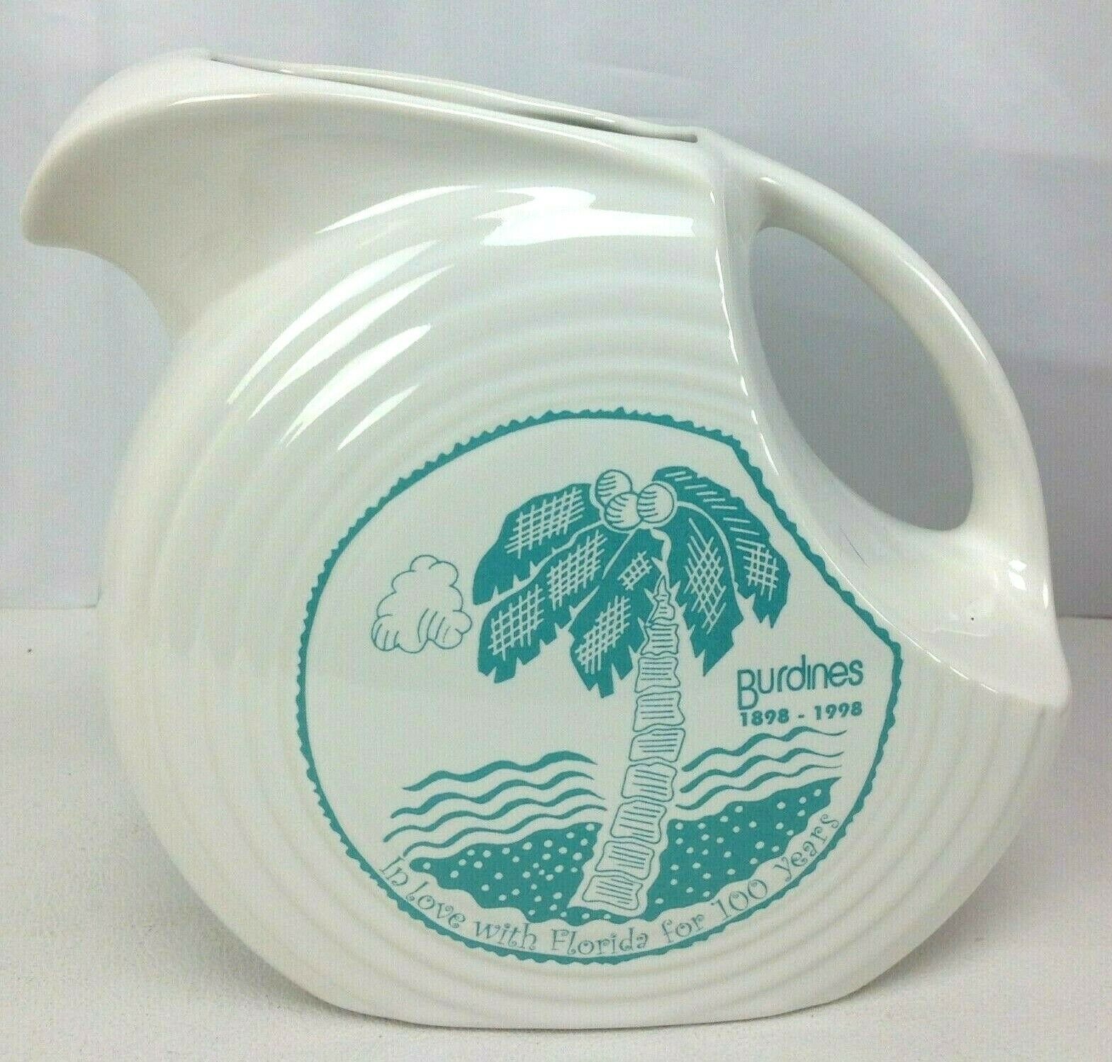 New 1998 Fiesta LARGE DISC PITCHER Florida Burdine's 100th Anniversary Retired RARE NEW OLD STOCK In 1997-1998 Burdine's Department stores in Florida commissioned Homer Laughlin Company to do a Large Disc Pitcher to celebrate their 100th anniversary. The pitcher reads "In Love with Florida for 100 years, Burdine's 1898-1998." Fiesta ware pitcher is white with turquoise graphics, Fiesta embossed into bottom. Contemporary Fiestaware - White/Turquoise "BURDINES 100TH ANNIVERSARY" Exclusive LARGE DISC PITCHER Holds 67-1/4 OZ Approx 7 1/4" tall, 8 1/2" spout to handle and 4 1/4 wide Limited Edition - I only have (2) available while they last! Item is Brand New! Comes as shown in photo; original sticker on bottom and unboxed. #10429,#10430, J6