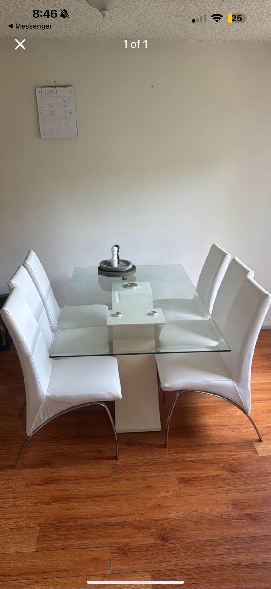 Custom new white leather chairs and glass table
