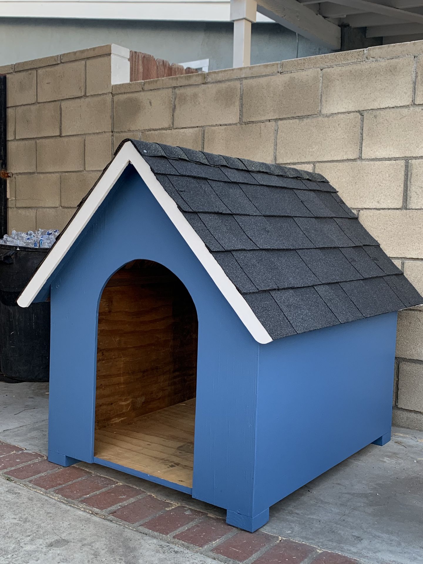 Large size dog house Measurements 32 inch wide 40 long 40 height Made with CDX plywood Exterior paint and primer Asphalt shingles Door size. 16 x 26.