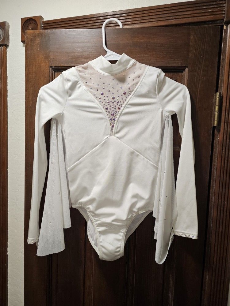 Beautiful snow white skating dress from Weissman. Leotard Size MC. No rips, no holes, no stains, no jewels missing. Only worn a few times before my daughter grew out of it. It is absolutely beautiful!