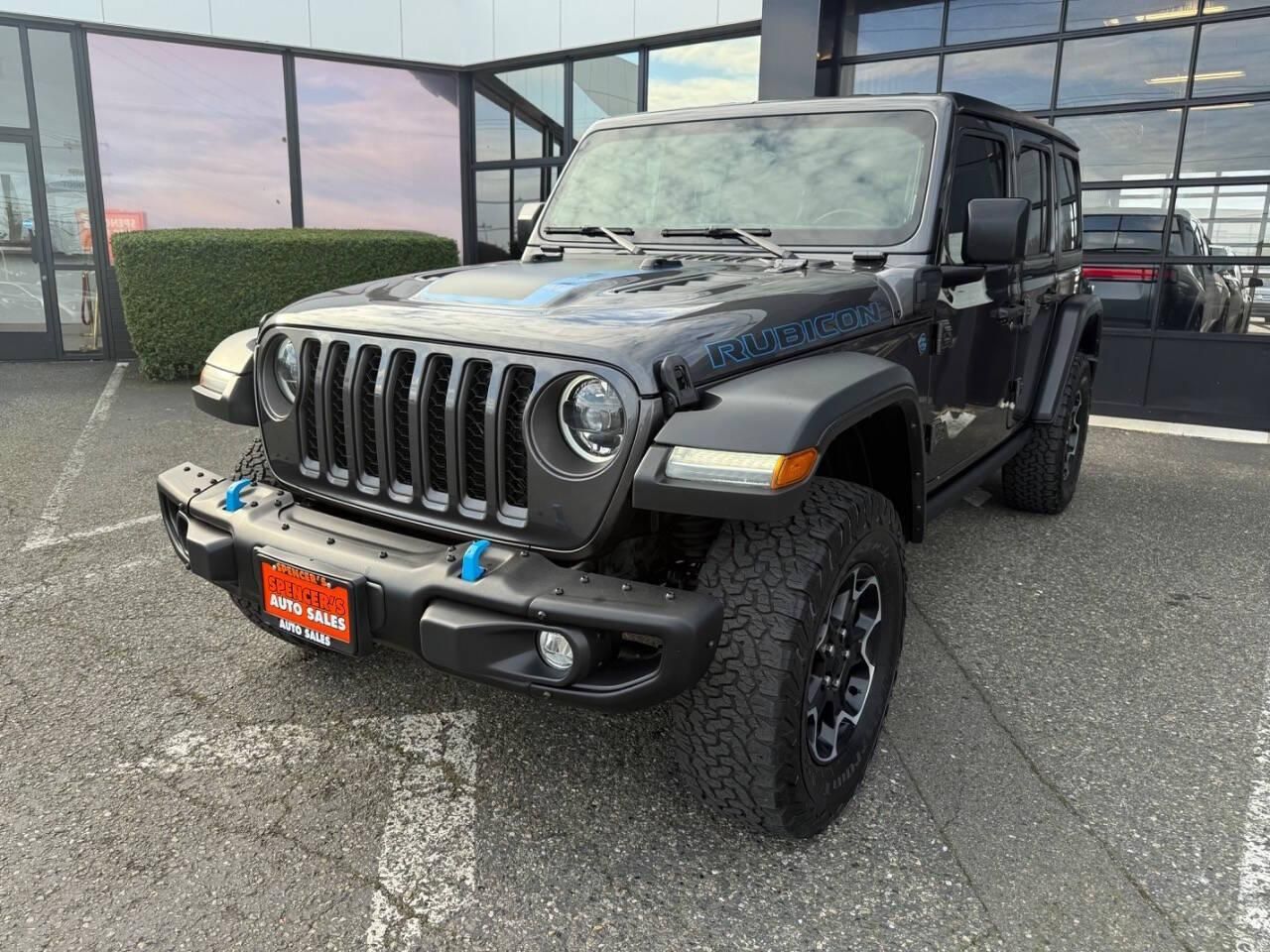 All trades welcome, creative financing options available! CALL 24/7 425-374-7726 Introducing the highly anticipated 2023 Jeep Wrangler Rubicon 4xe, the ultimate combination of power, capability, and sustainability. This rugged yet stylish vehicle is equipped with a state-of-the-art plug-in hybrid electric system, making it the perfect choice for off-roading adventures and everyday driving.<br /><br />Built for those who crave the thrill of the open road, the Wrangler Rubicon 4xe boasts a 2.0L turbo engine and two electric motors, providing a total output of 375 horsepower and 470 lb-ft of torque. And with its impressive 25-mile electric range, you can conquer any terrain with ease and efficiency.<br /><br />But the 4xe is not just about power, it's also about sustainability. With its regenerative braking system, you can charge the battery while on the go, reducing your carbon footprint and saving on fuel costs. Plus, the 4xe comes with an 8-year/100,000-mile warranty for the battery pack, giving you peace of mind for years to come.<br /><br />Inside, the Rubicon 4xe features luxurious leather-trimmed seats and a 7-inch touchscreen display with Jeep's Uconnect system, providing access to navigation, entertainment, and more. And with the added convenience of Apple CarPlay and Android Auto, you can stay connected no matter where your adventures take you.<br /><br />On the outside, the 2023 Wrangler Rubicon 4xe exudes ruggedness with its iconic seven-slot grille, aggressive fender flares, and 33-inch all-terrain tires. And with its removable doors and roof, you can truly experience the freedom and thrill of the open road.<br /><br />Don't miss your chance to own the ultimate off-roading machine with a touch of sustainability. Visit your nearest Jeep dealership and test drive the 2023 Wrangler Rubicon 4xe today!