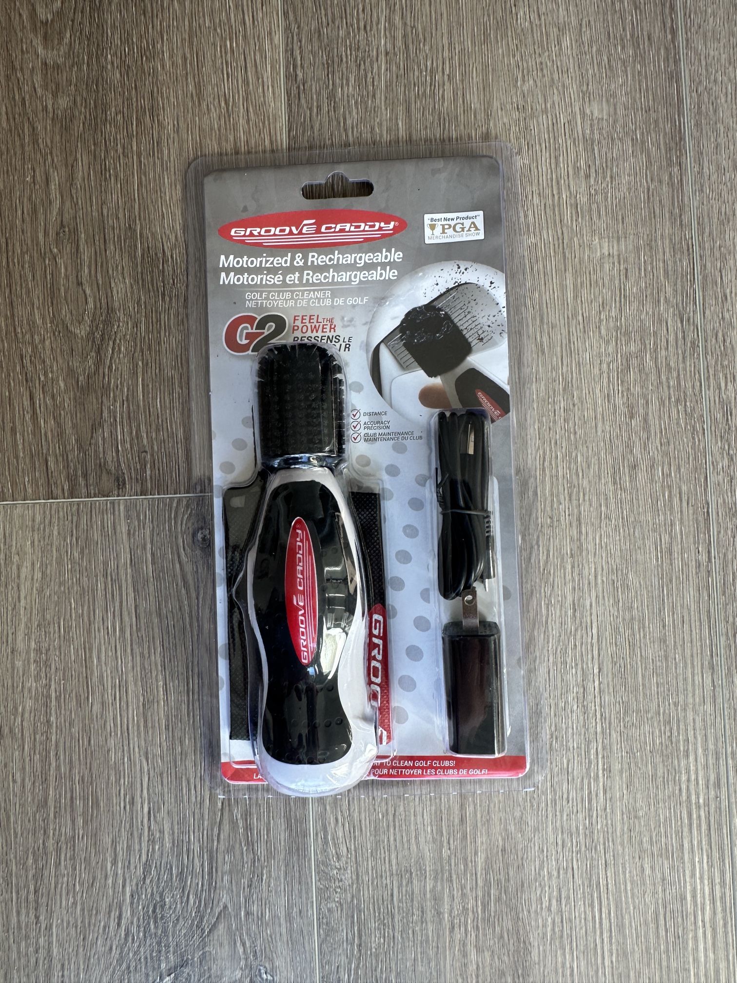 Brand new electric golf club cleaner. Groove caddy. The Groove Caddy G2 is the NEW, innovative way for golfers to clean their golf clubs. It is hand-held, has a 1,120 RPM motor, a 1400 MAH rechargeable lithium-ion battery and custom, non-abrasive nylon bristles. It can be used before, during and after a round of golf or practice session. The Groove Caddy is a revolutionary product and over 10,000 customers agree it is "the easiest and fastest way to clean golf clubs"! By digging and cleaning deep into the golf club grooves, the Groove Caddy will maximize golf club performance and maintenance. The Groove Caddy is engineered to polish the grooves of the golf club more effectively and quickly than a manual brush or towel - no more manual scrubbing. The Groove Caddy also makes the perfect gift for the golfer! Groove Caddy was awarded the 'Best New Product' at the Annual PGA Merchandise Show held in Orlando, Florida. It is the largest, most prestigious Golf Show in the world. See less