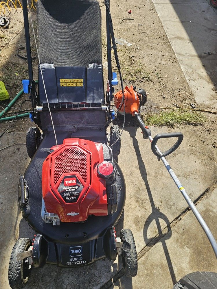 Toro super recycler self propelled lawn mower with rear wheel drive and 7.25 hp motor comes with Echo gt-225 weed eater both work great and ready to use