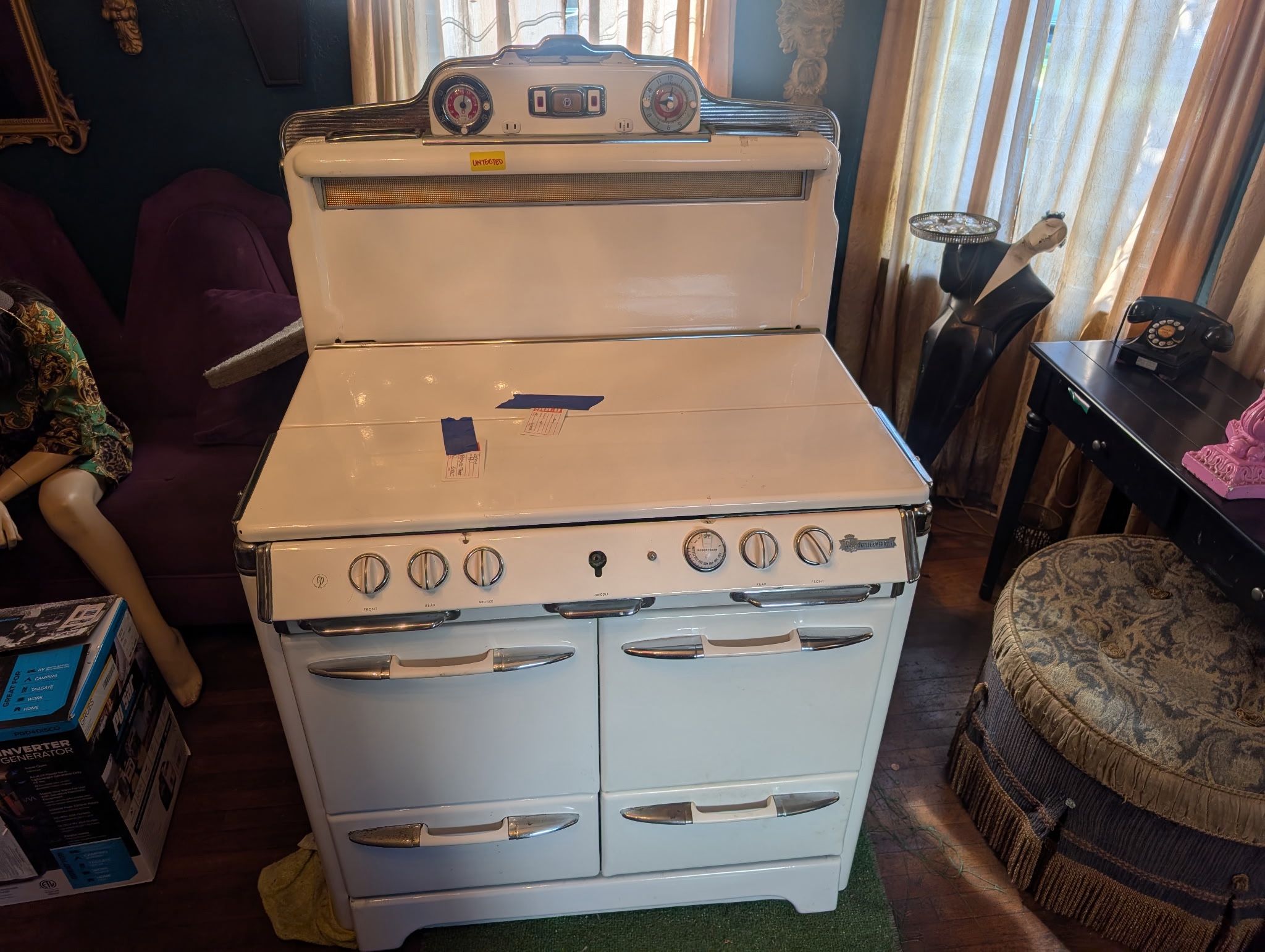 I purchased this stove to go into my new place... That deal feel threw! I ended up swapping the top cooking surfaces for my current stove stove. It appears that this stove was rebuilt internally and very clean.. I just need it gone at this point!! This is a 1952 antique O'Keefe &Merritt Cooking Stove, that means its "73" years old!! Still looks great and can put out some good homemade goodies!! With its white enamel glaze finish and vintage design, no wonder it stands out!! This freestanding stove features over head lighting, built in timer, salt and pepper shakers, 4 burners, a griddle surface, baking oven, broiler, with Grille Elevator" feature, and lower storage compartments. Made of cast iron with chrome accents, it runs on natural gas. When not in use, the "cooling self" can be lowered and closed for a serving area. Some dimensions... 38 inches across. 27 inches deep. 36 inches from ground to burner surface. 50 inches from ground to cooling self. 58 inches from ground to highest point (Lamp hood) This 73 year old American built stove makes the perfect classic kitchen setting. Its very heavy and will require a few guys.. I do have a 35 years of Antique stove experienced technician that can move this one out, deliver and set this up at your location of course for an extra cost. He has a hydraulic lift on his truck and knows what hes doing.. This is being offered at a reduced price of $300.00. Located in Long Beach near Ocean Ave and Cherry...